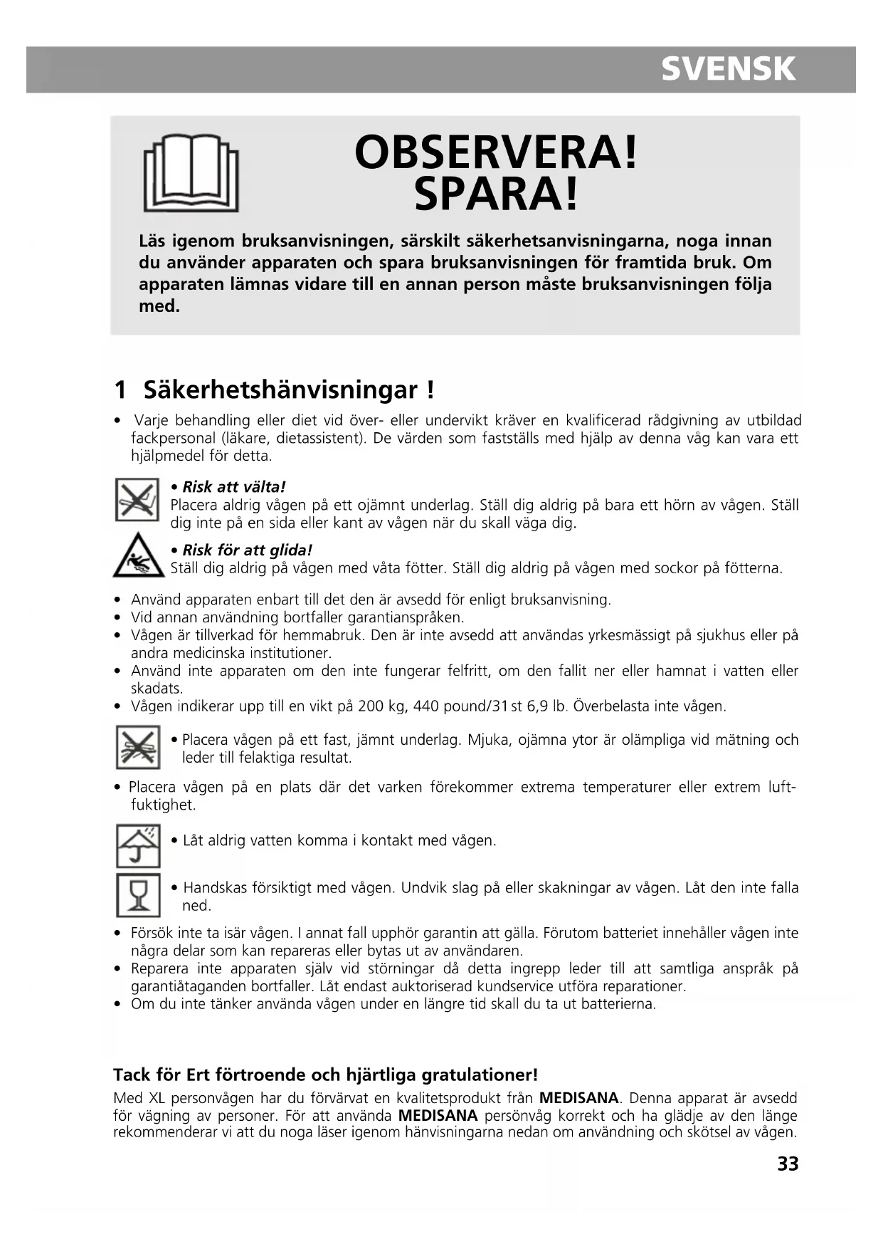 Försök inte ta isär vågen. I annat fall upphör garantin att gälla. Förutom batteriet innehåller vågen intenågra delar som kan repareras eller bytas ut av användaren. Reparera inte apparaten själv vid störningar då detta ingrepp leder till att samtliga anspråk pågarantiåtaganden bortfaller. Låt endast auktoriserad kundservice utföra reparationer. Om du inte tänker använda vågen under en längre tid skall du ta ut batterierna. Tack för Ert förtroende och hjärtliga gratulationer! Med XL personvågen har du förvärvat en kvalitetsprodukt från MEDISANA. Denna apparat är avsedd för vägning av personer. För att använda MEDISANA persönvåg korrekt och ha glädje av den länge rekommenderar vi att du noga läser igenom hänvisningarna nedan om användning och skötsel av vågen.40433_XL_Personenwaage_PS_460_29.07.qxd:Kompakt-GA 29.07.2013 21:23 Uhr Seite 3334 SVENSK