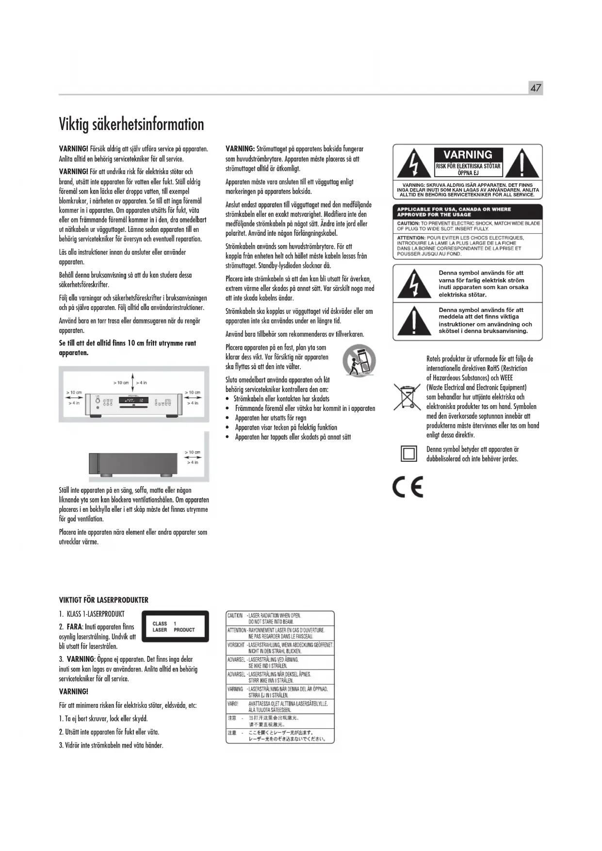 - ÖPPNA EJ VARNING: SKRUVA ALDRIG ISÄR APPARATEN. DET FINNS INGA DELAR INUTI SOM KAN LAGAS AV ANVÄNDAREN. ANLITA ALLTID EN BEHÖRIG SERVICETEKNIKER FÖR ALL SERVICE. Denna symbol används för att varna för farlig elektrisk ström inuti apparaten som kan orsaka elektriska stötar.Denna symbol används för att meddela att det finns viktiga instruktioner om användning och skötsel i denna bruksanvisning.48 RCD-1520 CD-spelare Om Rotel Vår historia började för nästan 50 år sedan. Under alla år som gått har våra produkter belönats med hundratals utmärkelser och roat hundratusentals människor som tar sin underhållning på allvar – precis som du!Rotel grundades av en familj med ett passionerat intresse för musik. Detta ledde till en egen tillverkning av hifi-produkter med en kompromisslös kvalitet. Genom alla år har denna passion för musik, som delas av hela Rotels personal, varit oförminskad och målet har alltid varit att tillverka prisvärda produkter för både audiofiler och musikälskare, vilken budget de än har.Rotels ingenjörer arbetar i team och har ett nära samarbete. Tillsammans lyssnar de på och finslipar varje ny produkt tills den lever upp till deras höga krav. De får välja komponenter från hela världen för att göra produkterna så bra som möjligt. I apparaterna hittar du ofta allt från brittiska och tyska kondensatorer till japanska och amerikanska halvledare samt toroidaltransformatorer som tillverkas i Rotels egna fabriker.Vi bryr oss om miljön. Eftersom allt mer elektronik tillverkas, och så småningom kasseras, är det särskilt viktigt att tillverkare gör vad de kan för att produkterna ska få så liten inverkan på sophantering och vattenmiljö som möjligt. På Rotel är vi stolta över att kunna bidra. Vi har reducerat blyinnehållet i vår elektronik genom att använda ett speciellt ROHS-lödtenn, och våra Class D-förstärkare (ej digitala) är upp till fem gånger mer effektiva än våra äldre modeller samtidigt som de är kraftfulla och har höga prestanda. Dessa produkter utvecklar lite värme, slösar minimalt med energi, är bra för miljön – och låter bättre. Slutligen är denna manual tryckt på återvunnet papper. Även om detta är små, första steg så är de viktiga. Och vi fortsätter att eftersträva nya metoder och material som ger en renare och grönare tillverkning.Alla vi på Rotel är glada för att du köpt denna produkt. Vi är övertygade om att den kommer att ge dig många års njutning och glädje. Om RCD-1520 RCD-1520 är i korta ordalag konstruerad för att göra en enda sak: återge ett väldetaljerat och nyanserat ljud från varje skiva. Oavsett om det är en vanlig CD-skiva eller en MP3- eller WMA-kodad skiva så återger RCD-1520 pålitligt allt som är inspelat. Under utvecklingen av RCD-1520 har projektgruppen arbetat med betydligt mer än konventionella, tekniska mätmetoder. Lyssningspaneler har ägnat hundratals timmar åt att fintrimma ljudkvaliteten och valt de komponenter som ger bäst ljud och ”släpper lös musikens känsla”. Vad artister och inspelningstekniker än har spelat in på skivorna så återges det av RCD-1520. Innehåll Figure 1: Funktioner och anslutningar 3Figure 2: Fjärrkontroll RR-D97 3Figure 3: Analoga utgångar 4Figure 4: Digitala utgångar 4Viktigt 5 Viktig säkerhetsinformation p. 47