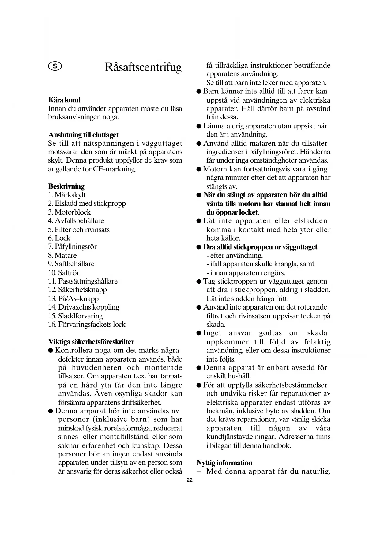 Viktiga säkerhetsföreskrifter ● Kontrollera noga om det märks några defekter innan apparaten används, både på huvudenheten och monterade tillsatser. Om apparaten t.ex. har tappats på en hård yta får den inte längre användas. Även osynliga skador kan försämra apparatens driftsäkerhet. ● Denna apparat bör inte användas av personer (inklusive barn) som har minskad fysisk rörelseförmåga, reducerat sinnes- eller mentaltillstånd, eller som saknar erfarenhet och kunskap. Dessa personer bör antingen endast använda apparaten under tillsyn av en person som är ansvarig för deras säkerhet eller också få tillräckliga instruktioner beträffande apparatens användning. Se till att barn inte leker med apparaten. ● Barn känner inte alltid till att faror kan uppstå vid användningen av elektriska apparater. Håll därför barn på avstånd från dessa. ● Lämna aldrig apparaten utan uppsikt när den är i användning. ● Använd alltid mataren när du tillsätter ingredienser i påfyllningsröret. Händerna får under inga omständigheter användas. ● Motorn kan fortsättningsvis vara i gång några minuter efter det att apparaten har stängts av. ● När du stängt av apparaten bör du alltid vänta tills motorn har stannat helt innan du öppnar locket. ● Låt inte apparaten eller elsladden komma i kontakt med heta ytor eller heta källor. ● Dra alltid stickproppen ur vägguttaget - efter användning, - ifall apparaten skulle krångla, samt - innan apparaten rengörs. ● Tag stickproppen ur vägguttaget genom att dra i stickproppen, aldrig i sladden. Låt inte sladden hänga fritt. ● Använd inte apparaten om det roterande filtret och rivinsatsen uppvisar tecken på skada. ● Inget ansvar godtas om skada uppkommer till följd av felaktig användning, eller om dessa instruktioner inte följts. ● Denna apparat är enbart avsedd för enskilt hushåll. ● För att uppfylla säkerhetsbestämmelser och undvika risker får reparationer av elektriska apparater endast utföras av fackmän, inklusive byte av sladden. Om det krävs reparationer, var vänlig skicka apparaten till någon av våra kundtjänstavdelningar. Adresserna finns i bilagan till denna handbok. Nyttig information