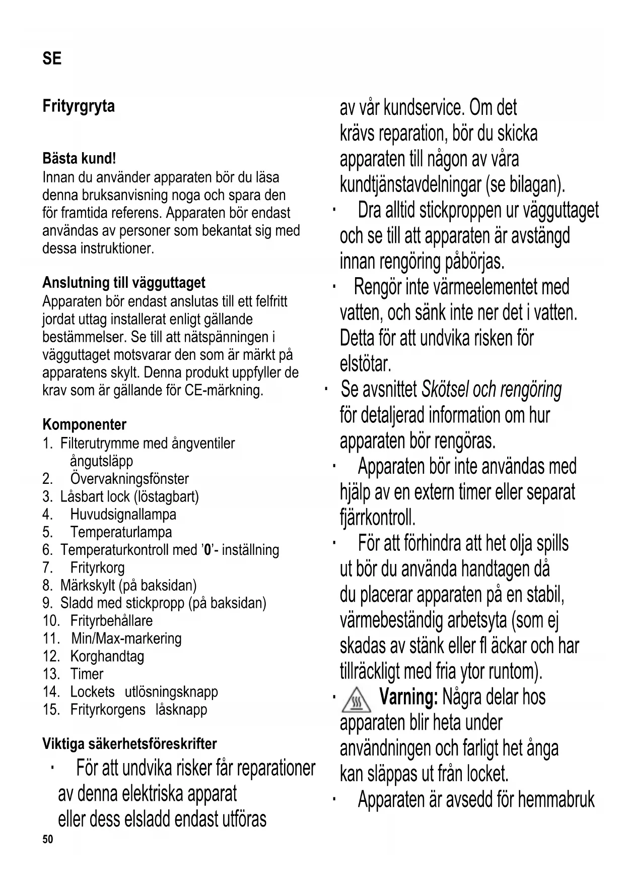 Varning: Några delar hos apparaten blir heta under användningen och farligt het ånga kan släppas ut från locket. ∙ Apparaten är avsedd för hemmabruk SE51 eller liknande användning, såsom - i personalkök, kontor och andra kommersiella miljöer, - i företag inom jordbrukssektorn, - för gäster i hotell, motell och liknande inkvarteringsställen, - för gäster i bed-and-breakfast hus. ∙ Barn under 8 år får ej använda apparaten. ∙ Äldre barn, 8 år eller äldre, får däremot använda apparaten om de är under ständig övervakning. ∙ Denna apparat kan användas av personer som har minskad fysisk rörelseförmåga, reducerat sinnes- eller mentaltillstånd, eller som har bristfällig erfarenhet och kunskap, förutsatt att dessa personer är under uppsyn eller har fått tillräckliga instruktioner beträffande apparatens användning och vet vilka risker och säkerhetsåtgärder som användningen innefattar. ∙ Barn bör inte tillåtas leka med apparaten. ∙ Barn bör inte tillåtas rengöra eller underhålla apparaten utan övervakning. ∙ Apparaten och dess elsladd bör hållas utom räckhåll för barn under 8 år. ∙ Varning: Håll barn på avstånd från apparatens förpackningsmaterial eftersom fara eventuellt kan uppstå. Det fi nns t.ex. risk för kvävning. ∙ Starta inte enhetens uppvärmning utan olja/fett. ∙ Lämna aldrig grytan utan tillsyn medan den är i användning. ∙ Innan varje användning bör apparaten samt dess elsladd och monterade tillbehör inspekteras noga så att de inte har några skador. Om apparaten t ex har tappats på en hård yta, eller om elsladden har utsatts för alltför hård kraft, bör den inte längre användas: Även osynliga skador kan försämra apparatens driftsäkerhet. ∙ Ställ inte apparaten under väggskåp eller hängande föremål, direkt intill en vägg eller i ett hörn. ∙ Se till att det inte fi nns lättantändliga material i närheten. ∙ Smält inte fett i fast form i en tom frityrgryta: fettet täcker inte värmeelementet helt och elementet kan därför överhettas så att fettet kan antändas vid kontakt. Det är också möjligt att den termiska säkerhetsspärren stänger av värmeelementet. ∙ Gammal olja/gammalt fett kan antändas vid överhettning. Om detta sker, dra ut stickproppen ur vägguttaget och lägg locket på apparaten för att kväva elden. Häll aldrig vatten på het eller brinnande olja (eller fett). ∙ Bär aldrig apparaten när den är het, t.ex. under eller omedelbart efter användning52 (man kan snubbla). Var ytterst försiktig: het olja/upphettat fett kan orsaka allvarliga brännskador. ∙ Rör inte vid den heta oljan eller det heta fettet med fi ngrarna. ∙ Lägg inga plastbestick i den heta oljan/det heta fettet. Häll aldrig het olja/upphettat fett i plastbehållare. ∙ Varning: Låt inte apparaten eller elsladden komma i kontakt med heta ytor eller heta källor. Låt inte elsladden hänga fritt; sladden måste hållas på säkert avstånd från apparatens heta delar. ∙ Dra alltid stickproppen ur vägguttaget - efter användning, - ifall apparaten skulle krångla, - innan apparaten rengörs. ∙ Ta stickproppen ur vägguttaget genom att dra i stickproppen, aldrig i sladden. ∙ Varning: Använd inte apparaten utomhus. ∙ Inget ansvar godtas om skada uppkommer till följd av felaktig användning, eller om dessa instruktioner inte följts. Innan första användningen Avlägsna allt förpackningsmaterial helt och rengör alla tillbehör enligt beskrivningen i avsnittet Skötsel och rengöring. För att undvika att vatten blandas med oljan bör alla delar torkas noga. Lock Locket öppnas genom att du trycker på utlösningsknappen. Locket är försett med fjäder och lyfts upp automatiskt när man trycker på knappen. För att stänga locket, tryck ned locket tills det låses på plats. När det öppna locket är i vertikal position kan det tas bort för rengöring genom att man drar det uppåt. Övervakningsfönster Med hjälp av övervakningsfönstret har du uppsikt över friteringsprocessen. För att undvika kondensering av vattenånga, bör en liten mängd olja strykas på insidan av fönstret. Frityrbehållaren Fyllningsmängd: Under uppvärmningen bör olje-/fettnivån ligga mellan minimi- och maximimärkena som fi nns i bakre delen av frityrbehållaren. Behållaren rymmer cirka 2.5 liter. Typer av olja/fett: Använd bara ren vegetabilisk olja/fett i fast form till denna frityrgryta. Oljan eller fettet kan hettas upp till 220 °C och har neutral smak. Blanda inte olika sorters olja/fett. Olja: Vi rekommenderar olja som är speciellt avsedd för fritering och som riskfritt kan upphettas till höga temperaturer. Vänligen notera maximimärket. Fett i fast form: Smält aldrig fett i fast form i en tom frityrgryta. Fast fett kan emellertid tillsättas direkt i frityrbehållaren om den redan innehåller fl ytande fett upp till minimimärket. Fettet bör först delas upp i mindre bitar och smältas i en separat gryta. Se till att fettet blir fl ytande men inte alltför hett: detta för att undvika brännskador när du häller över det fl ytande fettet till frityrbehållaren. Observera maximimärket när du fyller behållaren.53 Frityrkorg Korgen är avsedd att hålla maten som ska friteras. Se till att korgen inte fylls för mycket. Frityrgrytan rymmer högst 500 g pommes frites. Vänligen läs avsnittet Råd och tips för fritering. Med locket stängt kan korgen sänkas ned i den heta oljan med korghandtaget på apparatens utsida. Tryck låsknappen som fi nns inbyggd i handtaget framåt och tryck ner handtaget för att sänka ner korgen. Lyft korgen ur oljan genom att föra handtaget uppåt tills det låses i horisontalläge. Timer Genom att vrida timern medsols ställer du inte den önskade funktionstiden. Med timern inställd på position ’I’ är apparaten påkopplad permanent. Stäng av timern genom att vrida den tillbaka till dess ’0’-position. När du stä