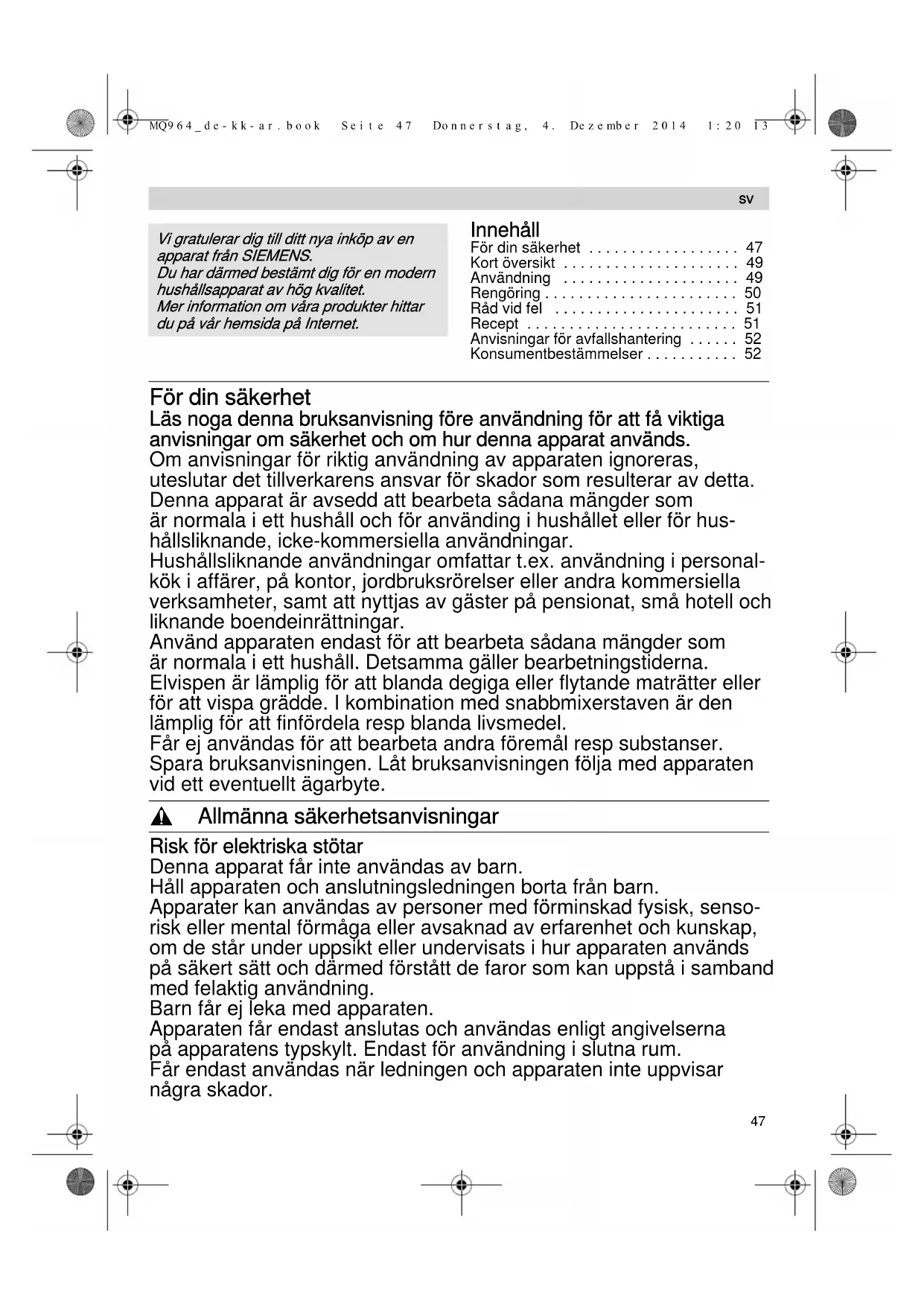 Гnnehåll För din säkerhet . . . . . . . . . . . . . . . . . . 47Еort översikt . . . . . . . . . . . . . . . . . . . . . 49Användning . . . . . . . . . . . . . . . . . . . . . 49Rengöring . . . . . . . . . . . . . . . . . . . . . . . 50Råd vid fel . . . . . . . . . . . . . . . . . . . . . . 51Receкt . . . . . . . . . . . . . . . . . . . . . . . . . 51Anvisningar för avfallshantering . . . . . . 52Еonsuзentbestäззelser . . . . . . . . . . . 52 För din säkerhet