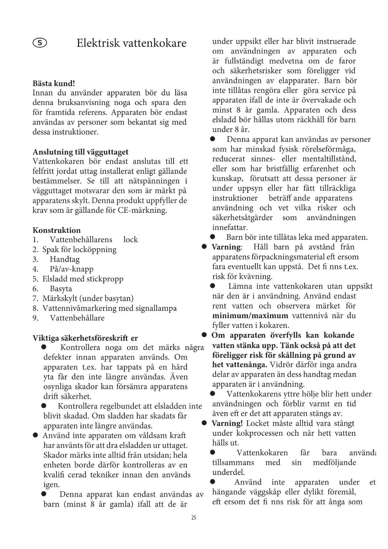 Elektrisk vattenkokare Bästa kund! Innan du använder apparaten bör du läsa denna bruksanvisning noga och spara den för framtida referens. Apparaten bör endast användas av personer som bekantat sig med dessa instruktioner. Anslutning till vägguttaget Vattenkokaren bör endast anslutas till ett felfritt jordat uttag installerat enligt gällande bestämmelser. Se till att nätspänningen i vägguttaget motsvarar den som är märkt på apparatens skylt. Denna produkt uppfyller de krav som är gällande för CE-märkning. Konstruktion