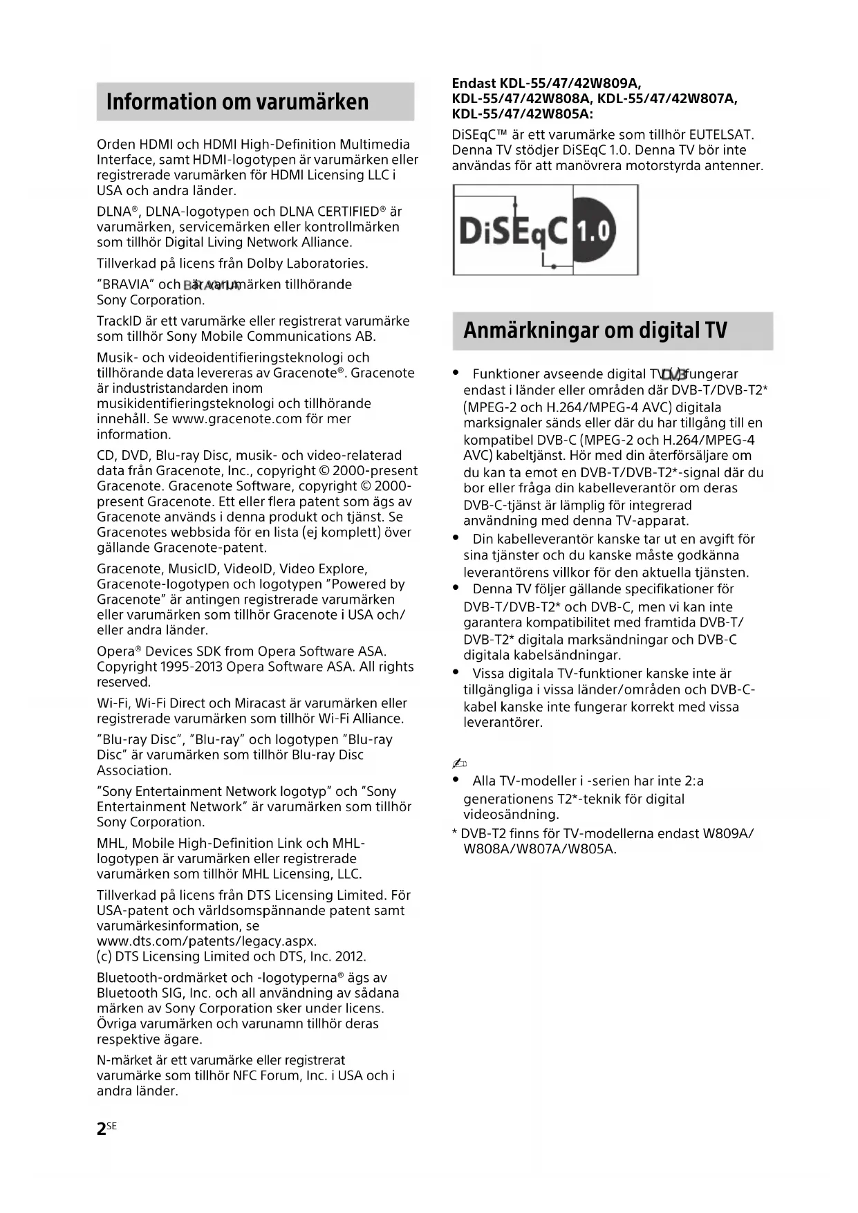 * DVB-T2 finns för TV-modellerna endast W809A/