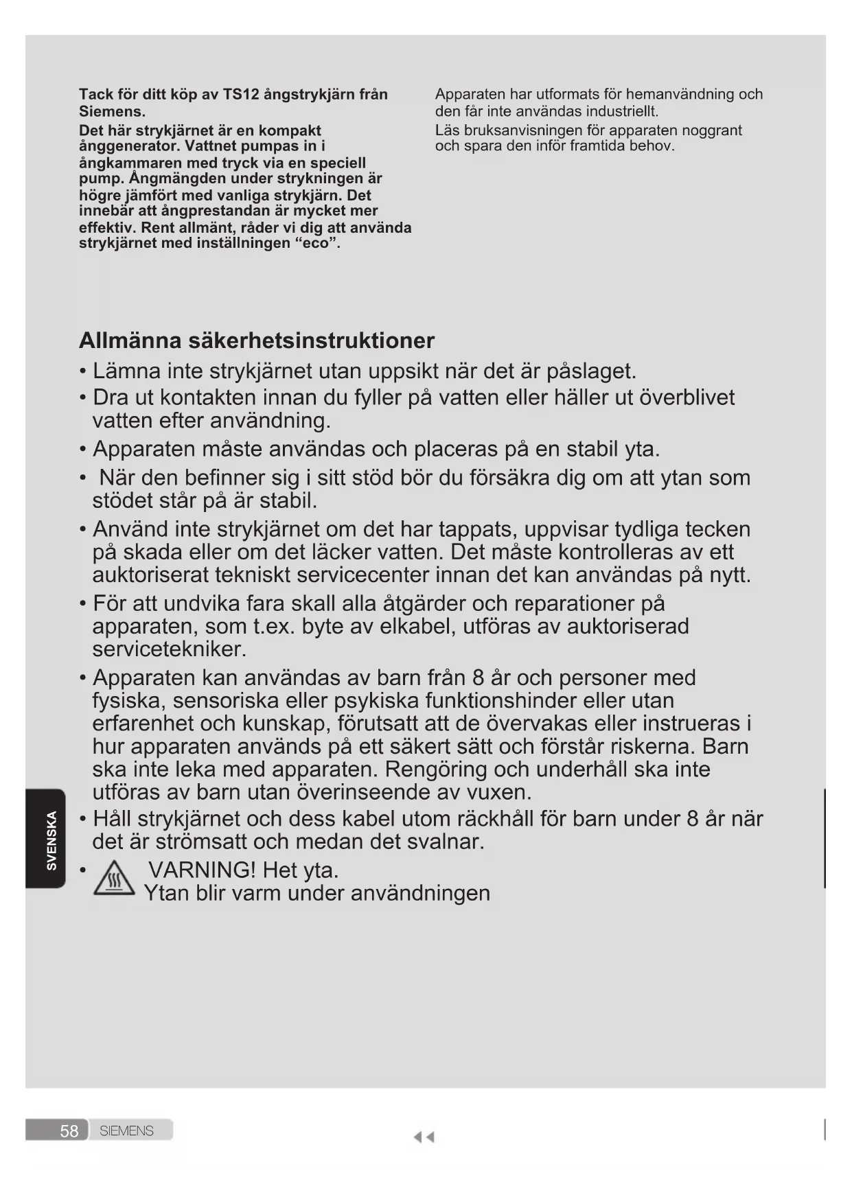 S I E M E N S SVENSKA Tack för ditt köp av TS12 ångstrykjärn från