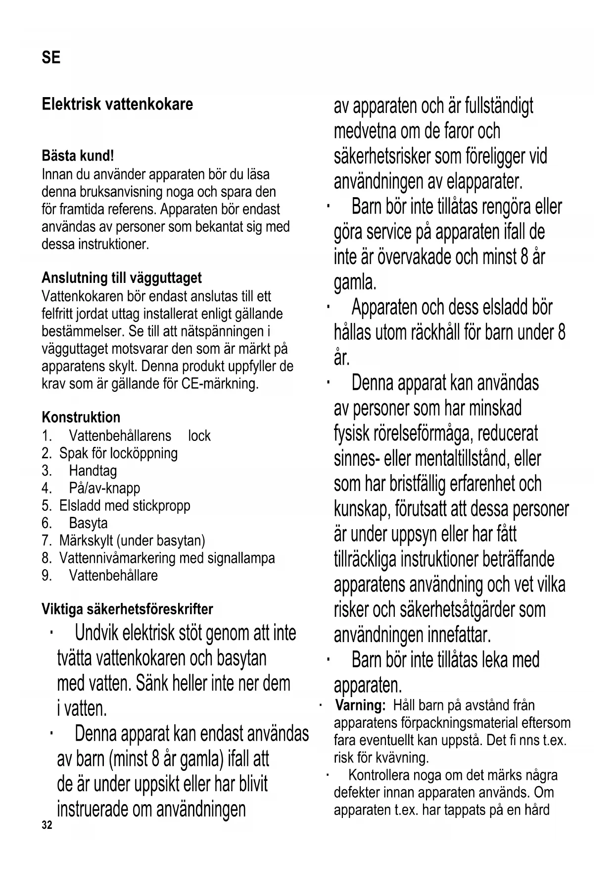Viktiga säkerhetsföreskrifter ∙ Undvik elektrisk stöt genom att inte tvätta vattenkokaren och basytan med vatten. Sänk heller inte ner dem i vatten. ∙ Denna apparat kan endast användas av barn (minst 8 år gamla) ifall att de är under uppsikt eller har blivit instruerade om användningen av apparaten och är fullständigt medvetna om de faror och säkerhetsrisker som föreligger vid användningen av elapparater. ∙ Barn bör inte tillåtas rengöra eller göra service på apparaten ifall de inte är övervakade och minst 8 år gamla. ∙ Apparaten och dess elsladd bör hållas utom räckhåll för barn under 8 år. ∙ Denna apparat kan användas av personer som har minskad fysisk rörelseförmåga, reducerat sinnes- eller mentaltillstånd, eller som har bristfällig erfarenhet och kunskap, förutsatt att dessa personer är under uppsyn eller har fått tillräckliga instruktioner beträffande apparatens användning och vet vilka risker och säkerhetsåtgärder som användningen innefattar. ∙ Barn bör inte tillåtas leka med apparaten. ∙ Varning: Håll barn på avstånd från apparatens förpackningsmaterial eftersom fara eventuellt kan uppstå. Det fi nns t.ex. risk för kvävning. ∙ Kontrollera noga om det märks några defekter innan apparaten används. Om apparaten t.ex. har tappats på en hård SE33 yta får den inte längre användas. Även osynliga skador kan försämra apparatens driftsäkerhet. ∙ Kontrollera regelbundet att elsladden inte blivit skadad. Om sladden har skadats får apparaten inte längre användas. ∙ Använd inte apparaten om våldsam kraft har använts för att dra elsladden ur uttaget. Skador märks inte alltid från utsidan; hela enheten borde därför kontrolleras av en kvalifi cerad tekniker innan den används igen. ∙ Lämna inte vattenkokaren utan uppsikt när den är i användning. Använd endast rent vatten och observera märket för minimum/maximum vattennivå när du fyller vatten i kokaren. ∙ Om apparaten överfylls kan kokande vatten stänka upp. Tänk också på att det föreligger risk för skållning på grund av het vattenånga. Vidrör därför inga andra delar av apparaten än dess handtag medan apparaten är i användning. ∙ Vattenkokarens yttre hölje blir hett under användningen och förblir varmt en tid även efter det att apparaten stängs av. ∙ Varning! Locket måste alltid vara stängt under kokprocessen och när hett vatten hälls ut. ∙ Vattenkokaren får bara användas tillsammans med sin medföljande underdel. ∙ Använd inte apparaten under ett hängande väggskåp eller dylikt föremål, eftersom det fi nns risk för att ånga som avges blir instängd därunder. ∙ Använd vattenkokaren endast på en värmebeständig, plan yta. ∙ Låt inte höljet eller elsladden komma i kontakt med öppen eld eller heta ytor såsom spisplattor. ∙ Låt inte elsladden hänga ner över bordskanten och se till att den inte kommer i kontakt med höljets heta delar. ∙ Dra alltid stickproppen ur vägguttaget - efter användning, - ifall apparaten skulle krångla, samt - innan apparaten rengörs. ∙ Tag stickproppen ur vägguttaget genom att dra i stickproppen, aldrig i sladden. ∙ Inget ansvar godtas om skada uppkommer till följd av felaktig användning, eller om dessa instruktioner inte följts. ∙ Apparaten är avsedd för hemmabruk eller liknande användning, såsom - i kontor och andra kommersiella miljöer, - inom jordbrukssektorn, - för kunder i hotell, motell och andra liknande anläggningar, - för kunder i bed-and-breakfast hus. ∙ För att uppfylla säkerhetsbestämmelser och undvika risker får reparationer av elektriska apparater endast utföras av fackmän, inklusive byte av sladden. Om det krävs reparationer, var vänlig skicka apparaten till någon av våra kundtjänstavdelningar. Adresserna fi nns i bilagan till denna handbok. Säkerhetsavstängning Det förinställda säkerhetsskyddet hindrar att värmeelementet blir överhettat ifall vattenkokaren skulle råka bli påslagen utan vatten eller om värmeelementet är förkalkat. När säkerhetsbrytaren har stängt av vattenkokaren bör du låta apparaten svalna eller kalka av den innan du kopplar på den igen.34 Innan första användningen Häll ut det kokta vattnet efter den första användningen för att säkerställa renligheten. Vattenkokning ∙ Tag bort vattenbehållaren från dess basyta. ∙ Öppna locket och fyll behållaren med vatten till önskad nivå. Observera min- och max-märkena. ∙ Stäng locket och placera behållaren tillbaka på dess basyta. ∙ Sätt stickproppen i ett lämpligt vägguttag och tryck på på/av-knappen; vattennivåmarkeringens signallampa tänds. ∙ Kokprocessen börjar. Efter att ha uppnått kokpunkten kopplas apparaten ifrån automatiskt av den inbyggda ångavstängningsanordningen. Signallampan slocknar. ∙ Om du vill avbryta kokprocessen ställer du på/av-knappen på läget »off». ∙ När du vill hälla ut hett vatten tar du vattenbehållaren av dess basyta. ∙ Du förhindrar att het ånga avges genom att se till att locket förblir stängt då du häller ut vattnet. ∙ Dra stickproppen ur vägguttaget efter användningen. ∙ Lämna inte vatten i behållaren. Elsladdens förvaring Elsladden förvaras uppvirad under basplattan vilket gör att längden på elsladden lätt kan begränsas under användningen samt gör det lätt att förvara apparaten. Avkalkning I områden med hårt vatten kan elementet få avlagringar av kalk. Vi rekommenderar att avlagringarna avlägsnas regelbundet. Garantikrav godkänns inte om vattenkokaren slutar fungera på grund av otillräcklig avkalkning. Det är lämpligt att använda en blandning av 0,5 liter vatten och två matskedar ättika. ∙ Häll avkalkningsmedlet i apparaten. ∙ Koppla på vattenkokaren och låt lösningen nå kokpunkten. ∙ Låt det verka en kort stund. ∙ Tvätta behållaren efter avkalkningen genom att skölja den noggrant med rent vatten