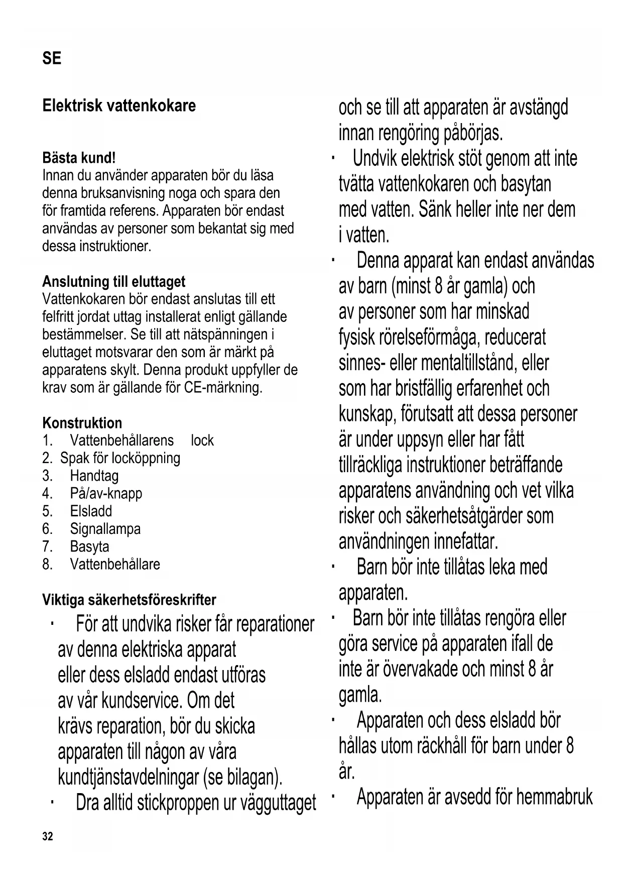 Viktiga säkerhetsföreskrifter ∙ För att undvika risker får reparationer av denna elektriska apparat eller dess elsladd endast utföras av vår kundservice. Om det krävs reparation, bör du skicka apparaten till någon av våra kundtjänstavdelningar (se bilagan). ∙ Dra alltid stickproppen ur vägguttaget och se till att apparaten är avstängd innan rengöring påbörjas. ∙ Undvik elektrisk stöt genom att inte tvätta vattenkokaren och basytan med vatten. Sänk heller inte ner dem i vatten. ∙ Denna apparat kan endast användas av barn (minst 8 år gamla) och av personer som har minskad fysisk rörelseförmåga, reducerat sinnes- eller mentaltillstånd, eller som har bristfällig erfarenhet och kunskap, förutsatt att dessa personer är under uppsyn eller har fått tillräckliga instruktioner beträffande apparatens användning och vet vilka risker och säkerhetsåtgärder som användningen innefattar. ∙ Barn bör inte tillåtas leka med apparaten. ∙ Barn bör inte tillåtas rengöra eller göra service på apparaten ifall de inte är övervakade och minst 8 år gamla. ∙ Apparaten och dess elsladd bör hållas utom räckhåll för barn under 8 år. ∙ Apparaten är avsedd för hemmabruk SE33 eller liknande användning, såsom - i kontor och andra kommersiella miljöer, - i företag inom jordbrukssektorn, - för gäster i hotell, motell och liknande inkvarteringsställen, - för gäster i bed-and-breakfast hus. ∙ Lämna inte vattenkokaren utan uppsikt när den är i användning. Använd endast rent vatten och observera märket för minimum/ maximum vattennivå när du fyller vatten i kokaren. Om apparaten överfylls kan kokande vatten stänka upp. ∙ Tänk också på att det föreligger risk för skållning på grund av het vattenånga. Vidrör därför inga andra delar av apparaten än dess handtag medan apparaten är i användning. ∙ Varning! Locket måste alltid vara stängt under kokprocessen och när hett vatten hälls ut. ∙ Vattenkokaren får bara användas tillsammans med sin medföljande underdel. ∙ Ta aldrig bort vattenbehållaren från basytan (eller sätt tillbaks den) medan apparaten är påkopplad. ∙ Varning: Håll barn på avstånd från apparatens förpackningsmaterial eftersom fara eventuellt kan uppstå. Det fi nns t.ex. risk för kvävning. ∙ Innan varje användning bör apparaten samt dess elsladd och monterade tillbehör inspekteras noga så att de inte har några skador. Om apparaten t ex har tappats på en hård yta, eller om elsladden har utsatts för alltför hård kraft, bör den inte längre användas: Även osynliga skador kan försämra apparatens driftsäkerhet. ∙ Använd vattenkokaren endast på en värmebeständig, plan yta. ∙ Använd inte apparaten under ett hängande väggskåp eller dylikt föremål, eftersom det fi nns risk för att ånga som bildas blir instängd därunder. ∙ Vattenkokarens yttre hölje blir hett under användningen och förblir varmt en tid även efter det att apparaten stängs av. ∙ Låt inte höljet eller elsladden komma i kontakt med öppen eld eller heta ytor såsom spisplattor. ∙ Låt inte elsladden hänga ner över bordskanten och se till att den inte kommer i kontakt med höljets heta delar. ∙ Dra alltid stickproppen ur vägguttaget - efter användning, - ifall apparaten skulle krångla, samt - innan apparaten rengörs. ∙ Inget ansvar godtas om skada uppkommer till följd av felaktig användning, eller om dessa instruktioner inte följts. Säkerhetsavstängning Det förinställda säkerhetsskyddet hindrar att värmeelementet blir överhettat ifall34 vattenkokaren skulle råka bli påslagen utan vatten eller om värmeelementet är förkalkat. När säkerhetsbrytaren har stängt av vattenkokaren bör du låta apparaten svalna eller kalka av den innan du kopplar på den igen. Innan första användningen Häll ut det kokta vattnet efter den första användningen för att säkerställa renligheten. Vattenkokning ∙ Ta bort vattenbehållaren från dess basyta. ∙ Tryck på lockets spak, öppna locket och fyll behållaren med vatten till önskad nivå. Observera min- och max-märkena. ∙ Stäng locket och placera behållaren tillbaka på dess basyta. ∙ Sätt stickproppen i ett lämpligt eluttag och tryck på på/av-knappen; Signallampan tänds. ∙ Kokprocessen börjar. Efter att ha uppnått kokpunkten kopplas apparaten ifrån automatiskt av den inbyggda ångavstängningsanordningen; Signallampan släcks. ∙ Om du vill avbryta kokprocessen ställer du till/från-brytaren på läge »från». ∙ När du vill hälla ut hett vatten lyfter du vattenbehållaren av dess basyta. ∙ Du förhindrar att het ånga avges genom att se till att locket förblir stängt då du häller ut vattnet. ∙ Dra stickproppen ur eluttaget efter användningen (den röda signallampan släcks). ∙ Lämna inte vatten i behållaren. Elsladdens förvaring Elsladden förvaras uppvirad under basplattan vilket gör att längden på elsladden lätt kan begränsas under användningen samt att förvaringen av apparaten underlättas. Avkalkning ∙ I bostadsområden med hårt vatten kan elementet få kalkavlagringar. Vi rekommenderar att avlagringarna avlägsnas regelbundet. ∙ Garantikrav godkänns inte om apparaten slutar fungera på grund av otillräcklig avkalkning. ∙ Det är lämpligt att använda en blandning av 0,5 liter vatten och 40 ml ättiksyra. ∙ Häll avkalkningsmedlet i apparaten. ∙ Koppla på vattenkokaren och låt lösningen nå kokpunkten. ∙ Låt det verka en kort stund. ∙ Tvätta behållaren efter avkalkningen genom att skölja den noggrant med rent vatten. ∙ Under avkalkningen bör du vädra tillräckligt och inte andas in ättiksångorna. ∙ Häll inte ut avkalkningsmedlet i emaljerade tvättställen. Rengöring och underhåll ∙ Se till att vattenkokaren inte är kopplad till eluttaget och att den har svalnat helt innan apparaten rengörs. ∙ Undvik elektrisk stöt genom att inte t