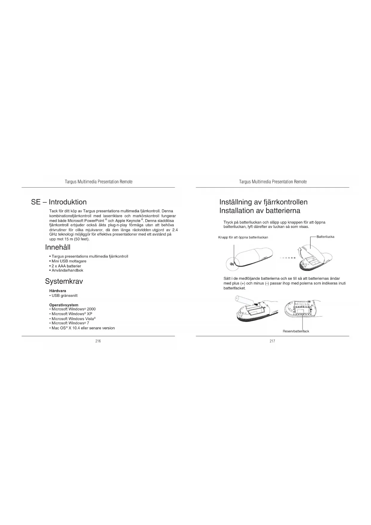 Tack för ditt köp av Targus presentations multimedia fjärrkontroll. Denna