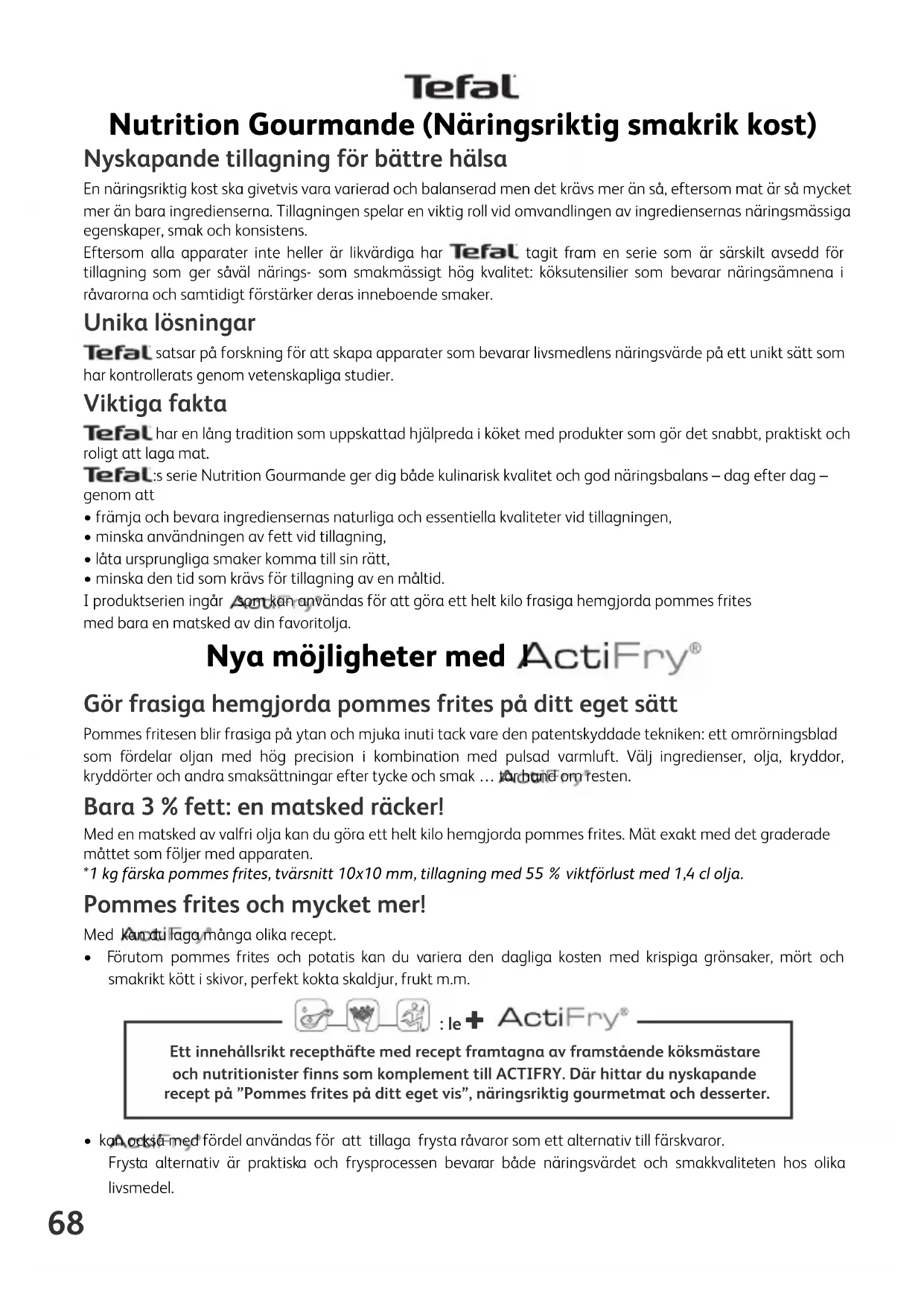 + • kan också med fördel användas för att tillaga frysta råvaror som ett alternativ till färskvaror. Frysta alternativ är praktiska och frysprocessen bevarar både näringsvärdet och smakkvaliteten hos olika livsmedel.Ett innehållsrikt recepthäfte med recept framtagna av framstående köksmästareoch nutritionister finns som komplement till ACTIFRY. Där hittar du nyskapanderecept på ”Pommes frites på ditt eget vis”, näringsriktig gourmetmat och desserter.69
