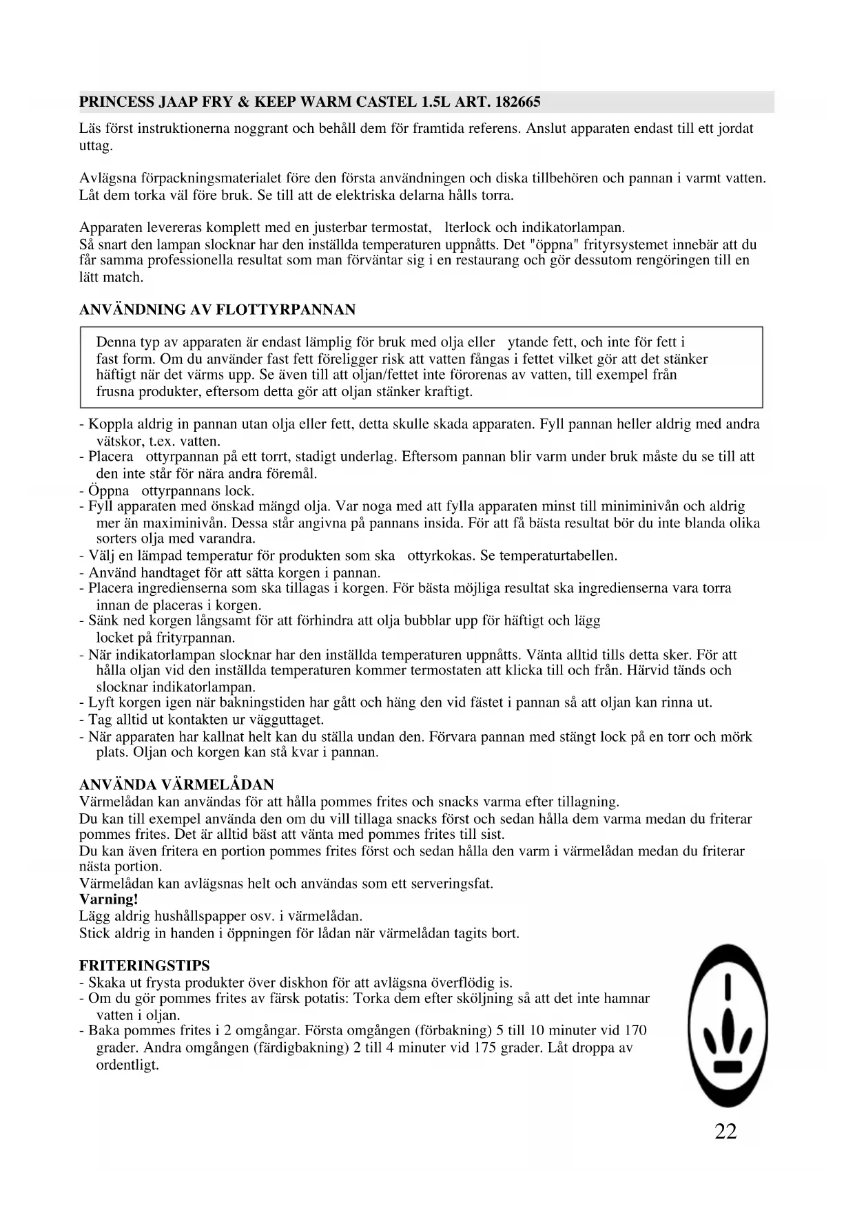 ANVÄNDNING AV FLOTTYRPANNAN Denna typ av apparaten är endast lämplig för bruk med olja eller flytande fett, och inte för fett i