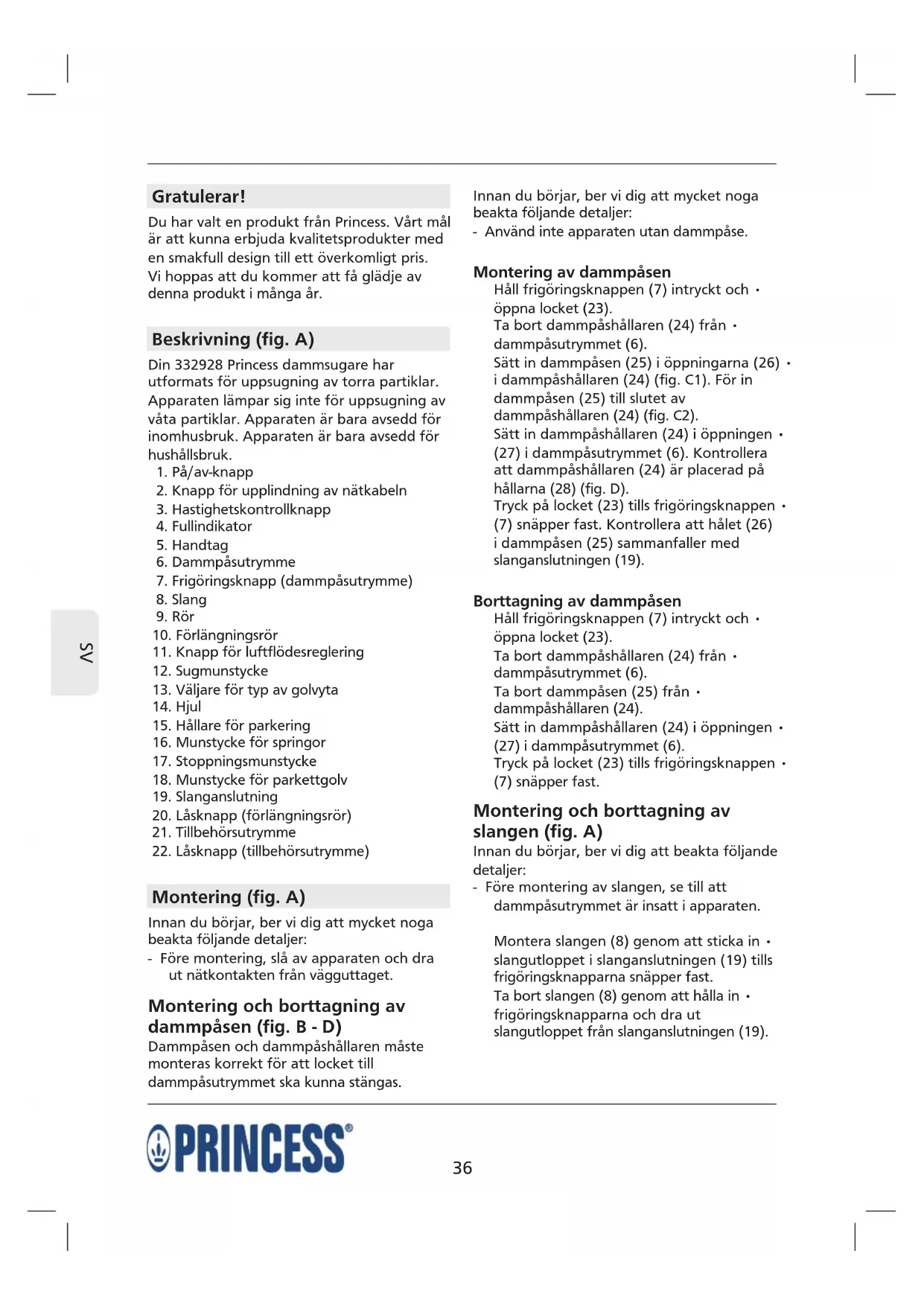 Gratulerar! Du har valt en produkt från Princess. Vårt mål är att kunna erbjuda kvalitetsprodukter med en smakfull design till ett överkomligt pris. Vi hoppas att du kommer att få glädje av denna produkt i många år. Beskrivning (fig. A) Din 332928 Princess dammsugare har utformats för uppsugning av torra partiklar. Apparaten lämpar sig inte för uppsugning av våta partiklar. Apparaten är bara avsedd för inomhusbruk. Apparaten är bara avsedd för hushållsbruk.