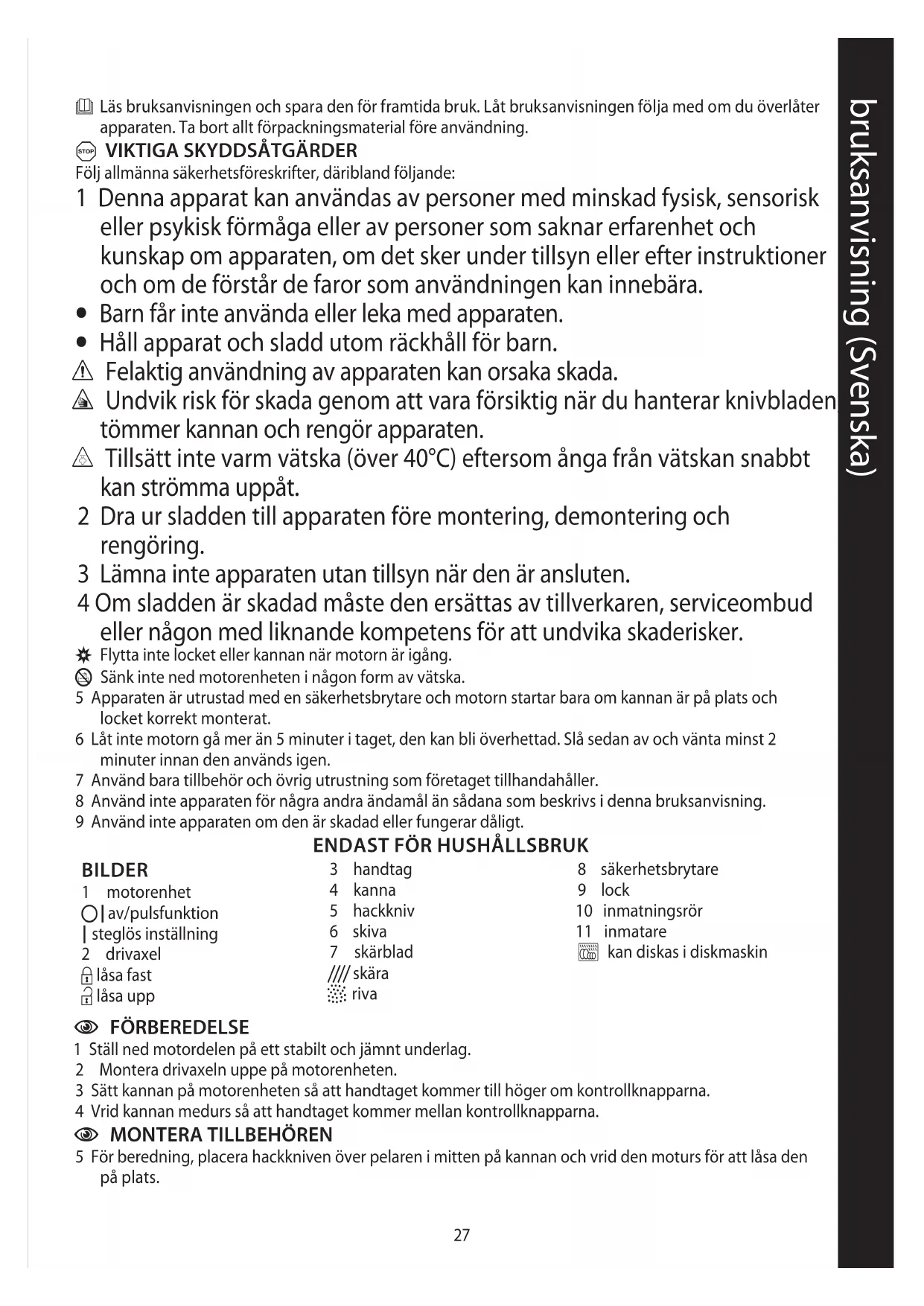 23 Använd inte fingrarna eller knivar till att föra ingredienserna genom inmatningsröret – endast