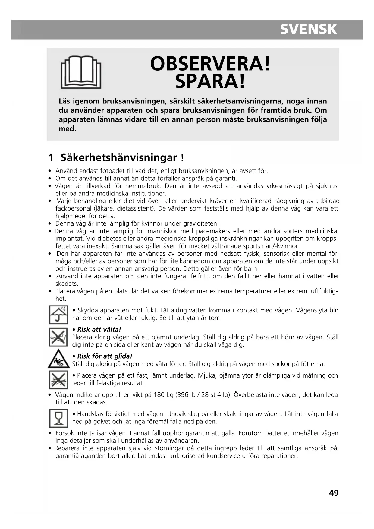 - Använd endast fotbadet till vad det, enligt bruksanvisningen, är avsett för.• Om det används till annat än detta förfaller anspråk på garanti.• Vågen är tillverkad för hemmabruk. Den är inte avsedd att användas yrkesmässigt på sjukhuseller på andra medicinska institutioner.• Varje behandling eller diet vid över- eller undervikt kräver en kvalificerad rådgivning av utbildadfackpersonal (läkare, dietassistent). De värden som fastställs med hjälp av denna våg kan vara etthjälpmedel för detta.• Denna våg är inte lämplig för kvinnor under graviditeten.• Denna våg är inte lämplig för människor med pacemakers eller med andra sorters medicinskaimplantat. Vid diabetes eller andra medicinska kroppsliga inskränkningar kan uppgiften om kropps-fettet vara inexakt. Samma sak gäller även för mycket vältränade sportsmän/-kvinnor.• Den här apparaten får inte användas av personer med nedsatt fysisk, sensorisk eller mental för-måga och/eller av personer som har för lite kännedom om apparaten om de inte står under uppsiktoch instrueras av en annan ansvarig person. Detta gäller även för barn.• Använd inte apparaten om den inte fungerar felfritt, om den fallit ner eller hamnat i vatten ellerskadats.