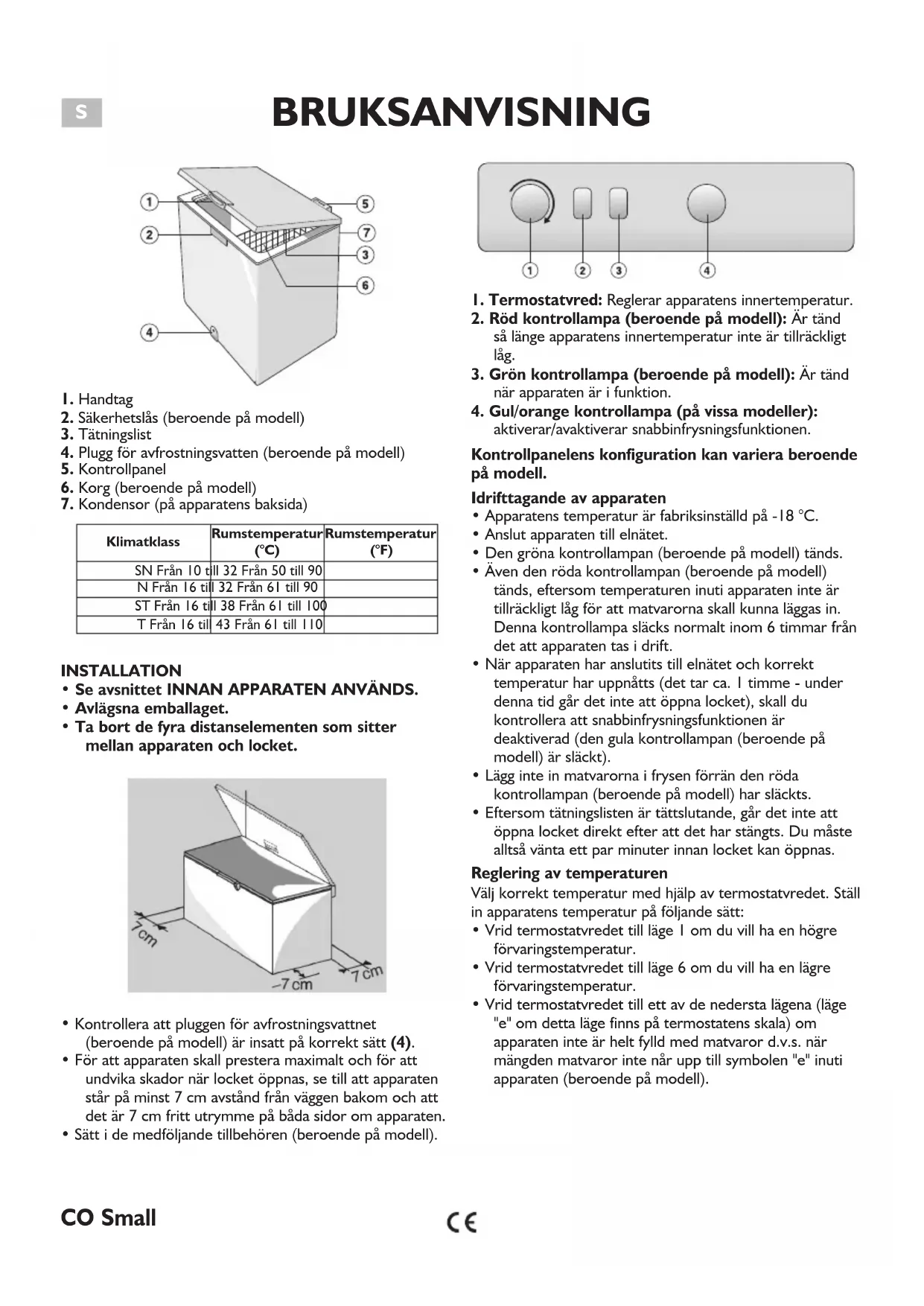 - Vrid termostatvredet till ett av de nedersta lägena (läge "e" om detta läge finns på termostatens skala) om apparaten inte är helt fylld med matvaror d.v.s. när mängden matvaror inte når upp till symbolen "e" inuti apparaten (beroende på modell). Klimatklass Rumstemperatur (°C) Rumstemperatur (°F) SN Från 10 till 32 Från 50 till 90 N Från 16 till 32 Från 61 till 90 ST Från 16 till 38 Från 61 till 100 T Från 16 till 43 Från 61 till 110 CO SmallBRUKSANVISNING