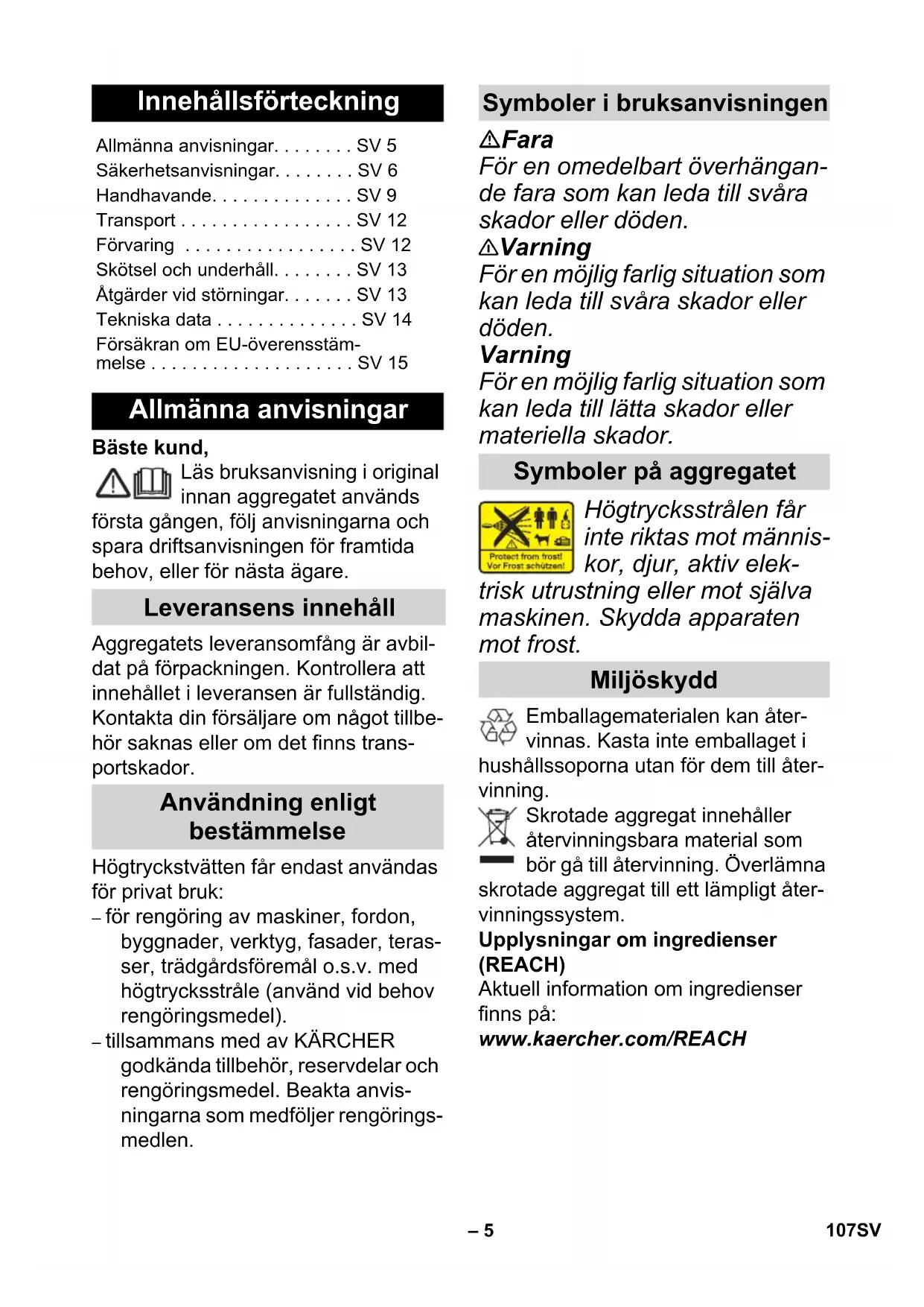 EN 61000–3–3: 2008 EN 62233: 2008 Anvendt metode for samsvarsvurde- ring 2000/14/EF: Vedlegg V Lydeffektnivå dB(A) Målt: 87 Garantert: 90 CEO Head of Approbation Winnenden, 2013/07/01 106 NO– 5 Bäste kund, Läs bruksanvisning i original innan aggregatet används första gången, följ anvisningarna och spara driftsanvisningen för framtida behov, eller för nästa ägare. Aggregatets leveransomfång är avbil- dat på förpackningen. Kontrollera att innehållet i leveransen är fullständig. Kontakta din försäljare om något tillbe- hör saknas eller om det finns trans- portskador. Högtryckstvätten får endast användas för privat bruk: – för rengöring av maskiner, fordon, byggnader, verktyg, fasader, teras- ser, trädgårdsföremål o.s.v. med högtrycksstråle (använd vid behov rengöringsmedel). – tillsammans med av KÄRCHER godkända tillbehör, reservdelar och rengöringsmedel. Beakta anvis- ningarna som medföljer rengörings- medlen. Fara För en omedelbart överhängan- de fara som kan leda till svåra skador eller döden. 몇 Varning För en möjlig farlig situation som kan leda till svåra skador eller döden. Varning För en möjlig farlig situation som kan leda till lätta skador eller materiella skador. Högtrycksstrålen får inte riktas mot männis- kor, djur, aktiv elek- trisk utrustning eller mot själva maskinen. Skydda apparaten mot frost. Emballagematerialen kan åter- vinnas. Kasta inte emballaget i hushållssoporna utan för dem till åter- vinning. Skrotade aggregat innehåller återvinningsbara material som bör gå till återvinning. Överlämna skrotade aggregat till ett lämpligt åter- vinningssystem. Upplysningar om ingredienser (REACH) Aktuell information om ingredienser finns på: www.kaercher.com/REACH Innehållsförteckning Allmänna anvisningar. . . . . . . . SV 5 Säkerhetsanvisningar. . . . . . . . SV 6 Handhavande. . . . . . . . . . . . . . SV 9 Transport . . . . . . . . . . . . . . . . . SV 12 Förvaring . . . . . . . . . . . . . . . . . SV 12 Skötsel och underhåll. . . . . . . . SV 13 Åtgärder vid störningar. . . . . . . SV 13 Tekniska data . . . . . . . . . . . . . . SV 14 Försäkran om EU-överensstäm- melse . . . . . . . . . . . . . . . . . . . . SV 15 Allmänna anvisningar Leveransens innehåll Användning enligt bestämmelse Symboler i bruksanvisningen Symboler på aggregatet Miljöskydd 107SV– 6 I respektive land gäller de garantivillkor som publicerats av våra auktoriserade distributörer. Eventuella fel på aggre- gatet repareras utan kostnad under förutsättning att det orsakats av ett ma- terial- eller tillverkningsfel. I frågor som gäller garantin ska du vända dig med kvitto till inköpsstället eller närmaste auktoriserade serviceverkstad. (Se baksidan för adress) Fara Ta aldrig i nätkabeln och nät- uttaget med fuktiga händer. Använd inte aggregatet om nätkabeln eller viktiga delar av aggregatet som t.ex. x högtrycksslang, sprutpistol eller säkerhetsanordningar är skadade. Kontrollera före varje anväd- ning att nätkabeln och dess nätkontakt inte är skadade. Skadade nätkablar ska ge- nast bytas ut av auktoriserad serviceverkstad eller en utbil- dad elektriker. Kontrollera före drift att hög- trycksslangen inte är skadad. Byt genast ut skadade hög- trycksslangar. Användning av aggregatet i utrymmen med explosions- risk är förbjuden. Vid användning av aggrega- tet i riskområden (t.ex. ben- sinmackar) ska motsvarande säkerhetsföreskrifter beak- tas. Högtrycksstrålar kan vid fel- aktig användning vara farliga. Strålen får inte riktas mot människor, djur, aktiv elek- trisk utrustning eller mot själ- va aggregatet. Rikta inte högtrycksstrålen mot dig själv eller mot andra för att rengöra kläder eller skor. Spruta aldrig på föremål som innehåller hälsovådliga äm- nen (t.ex. asbest). Däck eller däckventiler kan skadas och gå sönder av högtrycksstrålen. Första teck- net är att däcket missfärgas. Skadade däck/däckventiler kan innebära livsfara. Håll minst 30 cm strålavstånd vid rengöring! Risk för explosion! Inga brännbara vätskor får fördelas med högtryckstvät- ten. Sug aldrig upp vätskor som innehåller lösningsmedel el- ler outspädda syror och lös- ningsmedel! Hit räknas bl.a. bensin, tinner eller eldnings- olja. Ångan är lättantändlig, explosiv och giftig. Använd inte aceton, outspädda syror och lösningsmedel eftersom de angriper de material som använts i aggregatet. 몇 Varning Nätkontakt och kopplingar på förlängningsledningar måste vara vattentäta och får ej ligga i vatten. Garanti Säkerhetsanvisningar 108 SV– 7 Kopplingen får inte heller ligga på marken. Det rekommende- ras att man använder en ka- beltrumma som säkerställer att eluttagen befinner sig minst 60 mm över marken. Olämpliga elektriska förläng- ningskablar kan vara farliga. Använd endast tillåtna elek- triska förlängningskablar ut- omhus, med motsvarande märkning och med tillräckligt tvärsnitt: 1 - 10 m: 1,5 mm