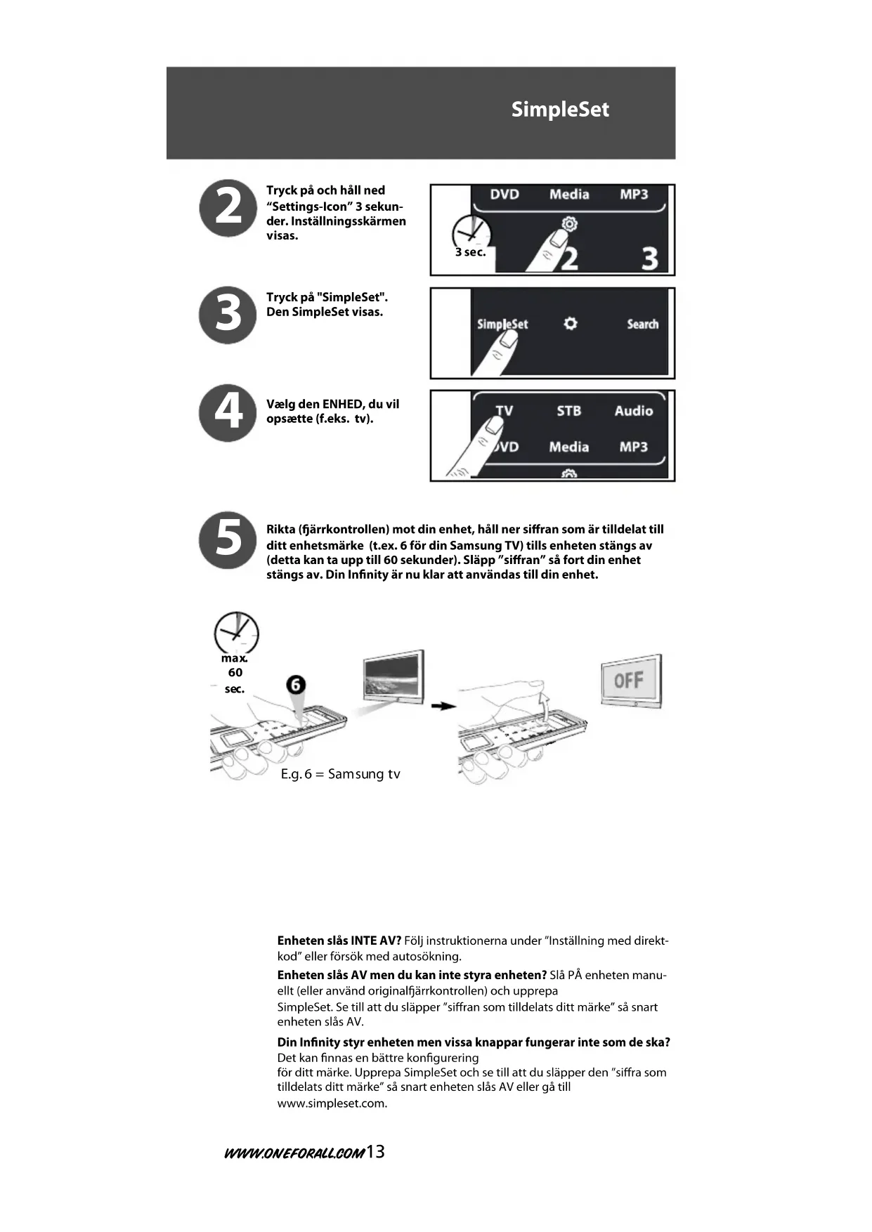 3 Rikta (ärrkontrollen) mot din enhet, håll ner siffran som är tilldelat tillditt enhetsmärke (t.ex. 6 för din Samsung TV) tills enheten stängs av(detta kan ta upp till 60 sekunder). Släpp ”siffran” så fort din enhetstängs av. Din Infinity är nu klar att användas till din enhet. Enheten slås INTE AV? Följ instruktionerna under ”Inställning med direkt-kod” eller försök med autosökning.Enheten slås AV men du kan inte styra enheten? Slå PÅ enheten manu-ellt (eller använd originalärrkontrollen) och upprepaSimpleSet. Se till att du släpper ”siffran som tilldelats ditt märke” så snartenheten slås AV.Din Infinity styr enheten men vissa knappar fungerar inte som de ska?Det kan finnas en bättre konfigureringför ditt märke. Upprepa SimpleSet och se till att du släpper den ”siffra somtilldelats ditt märke” så snart enheten slås AV eller gå tillwww.simpleset.com. SimpleSet