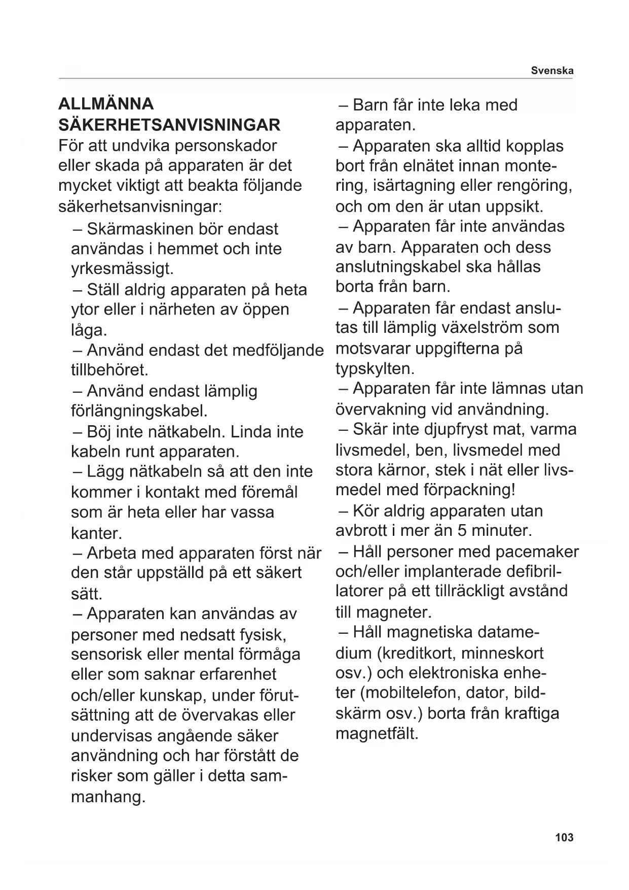 Симбол прецртане канте за отпатке на точковима указује на потребу за одвојеним прикупљањем. Погодно за контакт са храном Уређај класе заштите II103 Svenska ALLMÄNNA SÄKERHETSANVISNINGAR För att undvika personskador eller skada på apparaten är det mycket viktigt att beakta följande säkerhetsanvisningar: – Skärmaskinen bör endast användas i hemmet och inte yrkesmässigt. – Ställ aldrig apparaten på heta ytor eller i närheten av öppen låga. – Använd endast det medföljande tillbehöret. – Använd endast lämplig förlängningskabel. – Böj inte nätkabeln. Linda inte kabeln runt apparaten. – Lägg nätkabeln så att den inte kommer i kontakt med föremål som är heta eller har vassa kanter. – Arbeta med apparaten först när den står uppställd på ett säkert sätt. – Apparaten kan användas av personer med nedsatt fysisk, sensorisk eller mental förmåga eller som saknar erfarenhet och/eller kunskap, under förut- sättning att de övervakas eller undervisas angående säker användning och har förstått de risker som gäller i detta sam- manhang. – Barn får inte leka med apparaten. – Apparaten ska alltid kopplas bort från elnätet innan monte- ring, isärtagning eller rengöring, och om den är utan uppsikt. – Apparaten får inte användas av barn. Apparaten och dess anslutningskabel ska hållas borta från barn. – Apparaten får endast anslu- tas till lämplig växelström som motsvarar uppgifterna på typskylten. – Apparaten får inte lämnas utan övervakning vid användning. – Skär inte djupfryst mat, varma livsmedel, ben, livsmedel med stora kärnor, stek i nät eller livs- medel med förpackning! – Kör aldrig apparaten utan avbrott i mer än 5 minuter. – Håll personer med pacemaker och/eller implanterade debril- latorer på ett tillräckligt avstånd till magneter. – Håll magnetiska datame- dium (kreditkort, minneskort osv.) och elektroniska enhe- ter (mobiltelefon, dator, bild- skärm osv.) borta från kraftiga magnetfält.104 Risk för elstöt – Vid driftstörningar, före varje rengöring och när apparaten inte är i bruk ska stickkontakten alltid dras ut ur eluttaget. Dra då alltid i kontakten och inte i kabeln. – Doppa aldrig apparaten i vat- ten. Utsätt aldrig apparaten för regn eller annan fukt. Om apparaten ändå hamnar i vat- ten någon gång ska stickkon- takten först dras ut ur eluttaget och först därefter ska appara- ten tas upp ur vattnet. Lämna sedan in apparaten för översyn på ett behörigt serviceställe innan den åter tas i bruk. – Använd inte apparaten med fuktiga händer. Använd den inte om den är fuktig eller våt eller om du står på ett fuktigt golv. Använd inte apparaten utomhus. – Ta apparaten genast ur bruk vid skador på dess delar och kontakta ritter kundtjänst. – Om nätkabeln skadas måste den bytas ut av tillverkaren, dess kundtjänst eller liknande behörig person för att undvika risker. Risk för personskador – Apparaten får inte användas utan matarvagn eller resthål- lare, såvida inte storleken eller formen på det som ska skivas gör det omöjligt att använda dessa. – Innan byte av tillbehör eller extra delar som är rörliga vid bruk måste apparaten stängas av och skiljas från elnätet. – Klingan är mycket vass. – Rör aldrig klingan när appara- ten är i bruk! – Stäng av apparaten innan rengöring, dra ut stickkontakten ur eluttaget och vrid inställ- ningsvredet för skivtjocklek till läge ”0”. – Klingan fortsätter att rotera en stund efter avstängning. Svenska105 Svenska Slå upp bilderna på bokomsla- gets insida i början och slutet. Läs noga igenom anvisningen innan apparaten tas i bruk. Spara bruksanvisningen och skicka med den när apparaten lämnas vidare. Den aktuella bruksanvisningen står även till förfogande på www.ritterwerk.de. ANVÄNDNING Skärmaskinen används för att skära livsmedel som förekommer i hemmet. Skärmaskinen är lämplig för livsmedel. Ej avsett bruk eller felak- tig användning kan leda till svåra personskador eller skada på apparaten. I sådana fall gäller inga garanti- eller ansvarsanspråk.