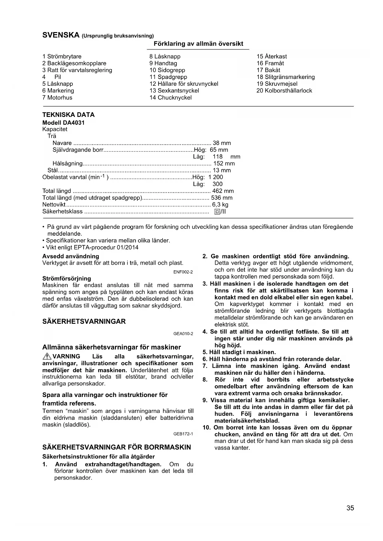 SÄKERHETSVARNINGAR FÖR BORRMASKIN Säkerhetsinstruktioner för alla åtgärder