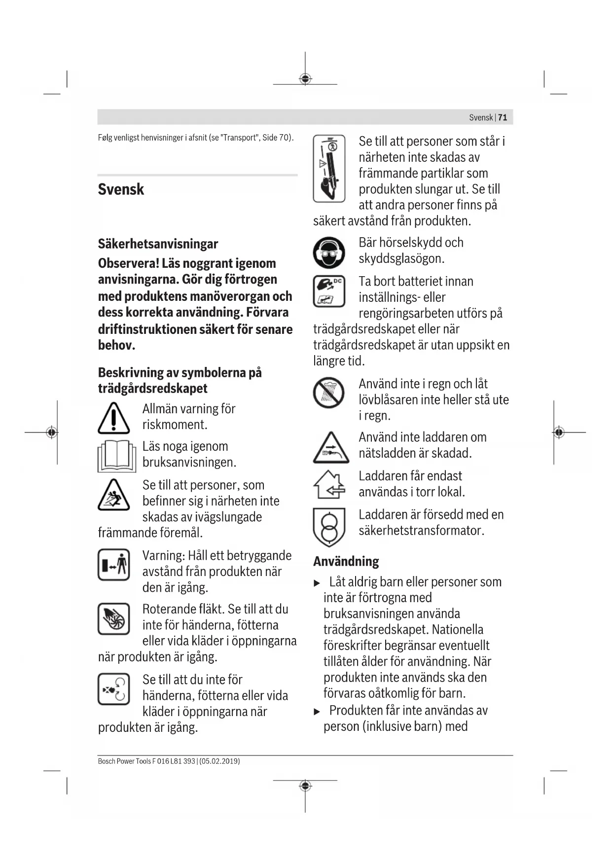 u Bemærk: Sluk for haveredskabet og fjern akkuen, før indstillings- eller rengøringsarbejde gennemføres. Vedligeholdelse, rengøring og opbevaring u Hold produktet rent for at kunne arbejde godt og sik- kert. Rengør altid ventilatoren og området omkring ventilatoren efter brug for at sikre en optimal brug. Hold altid produktet og ventilationsåbningerne rene for at kunne arbejde godt og sikkert. Fjern snavs fra produktet eller opsamlerposen med en fugtig klud. Sprøjt aldrig vand på produktet. Dyp aldrig produktet i vand. Opbevar produktet et sikkert sted, som skal være tørt og uden for børns rækkevidde. Stil ikke andre genstande fra på produktet. Akku-pleje Overhold følgende forskrifter og foranstaltninger for at mu- liggøre en optimal brug af akkuen: – Beskyt akkuen mod fugtighed og vand. – Opbevar kun haveredskabet og akkuen ved temperaturer mellem -20 °C og 50 °C. Lad f.eks. ikke akkuen blive lig- gende i bilen om sommeren. – Opbevar akkuen separat og ikke i haveredskabet. – Lad ikke akkuen blive siddende i haveredskabet i solskinsvejr. – Den optimale temperatur til opbevaring af akkuen er 5 °C. – Rengør akkuens ventilationsåbninger en gang imellem med en blød, ren og tør pensel. Når driftstiden efter opladningen forkortes væsentligt, er det tegn på, at akkuen er slidt op og skal udskiftes. Kundeservice og anvendelsesrådgivning www.bosch-garden.com Produktets 10‑cifrede varenummer (se typeskilt) skal altid angives ved forespørgsler og bestilling af reservedele. Dansk Bosch Service Center Telegrafvej 3 2750 Ballerup På www.bosch-pt.dk kan der online bestilles reservedele el- ler oprettes en reparations ordre. Tlf. Service Center: 44898855 Fax: 44898755 E-Mail: vaerktoej@dk.bosch.com Transport De indeholdte Li-Ion-akkuer overholder bestemmelserne om farligt gods. Akkuerne kan transporteres af brugeren på of- fentlig vej uden yderligere pålæg. Ved forsendelse gennem tredjemand (f.eks.: lufttransport el- ler spedition) skal særlige krav vedr. emballage og mærkning overholdes. Her skal man kontakte en faregodsekspert, før forsendelsesstykket forberedes. Send kun akkuer, hvis huset er ubeskadiget. Tilklæb åbne kontakter, og indpak akkuen på en sådan måde, at den ikke kan bevæge sig i emballagen. Følg venligst også eventuelle, videreførende, nationale forskrifter. Bortskaffelse Haveredskaber, akku, tilbehør og emballage skal genbruges på en miljøvenlig måde. Smid ikke haveredskaber og ak- kuer/batterier ud sammen med det almindelige husholdningsaf- fald! Gælder kun i EU‑lande: Iht. det europæiske direktiv 2012/19/EU skal affald af elek- trisk og elektronisk udstyr (WEEE) og iht. det europæiske di- rektiv 2006/66/EF skal defekte eller opbrugte akkuer/batte- rier indsamles separat og genbruges iht. gældende miljøfor- skrifter. Akkuer/batterier: Li-Ion: F 016 L81 393 | (05.02.2019) Bosch Power ToolsSvensk | 71 Følg venligst henvisninger i afsnit (se "Transport", Side70). Svensk Säkerhetsanvisningar Observera! Läs noggrant igenom anvisningarna. Gör dig förtrogen med produktens manöverorgan och dess korrekta användning. Förvara driftinstruktionen säkert för senare behov. Beskrivning av symbolerna på trädgårdsredskapet Allmän varning för riskmoment. Läs noga igenom bruksanvisningen. Se till att personer, som befinner sig i närheten inte skadas av ivägslungade främmande föremål. Varning: Håll ett betryggande avstånd från produkten när den är igång. Roterande fläkt. Se till att du inte för händerna, fötterna eller vida kläder i öppningarna när produkten är igång. Se till att du inte för händerna, fötterna eller vida kläder i öppningarna när produkten är igång. Se till att personer som står i närheten inte skadas av främmande partiklar som produkten slungar ut. Se till att andra personer finns på säkert avstånd från produkten. Bär hörselskydd och skyddsglasögon. Ta bort batteriet innan inställnings- eller rengöringsarbeten utförs på trädgårdsredskapet eller när trädgårdsredskapet är utan uppsikt en längre tid. Använd inte i regn och låt lövblåsaren inte heller stå ute i regn. Använd inte laddaren om nätsladden är skadad. Laddaren får endast användas i torr lokal. Laddaren är försedd med en säkerhetstransformator. Användning u Låt aldrig barn eller personer som inte är förtrogna med bruksanvisningen använda trädgårdsredskapet. Nationella föreskrifter begränsar eventuellt tillåten ålder för användning. När produkten inte används ska den förvaras oåtkomlig för barn. u Produkten får inte användas av person (inklusive barn) med Bosch Power Tools F 016 L81 393 | (05.02.2019)72 | Svensk begränsad fysisk, sensorisk eller psykisk förmåga och/eller som saknar den erfarenhet och kunskap som krävs för hantering. Undantag görs om personen övervakas av en för hens säkerhet ansvarig person som kan undervisa i redskapets användning. Barn bör övervakas för att säkerställa att de inte leker med produkten. u Använd aldrig produkten när personer, speciellt då barn eller husdjur, uppehåller sig i närheten. u Användaren ansvarar för olyckor och skador som drabbar andra människor eller deras egendom. u Under användningen får inga andra personer eller djur uppehålla sig inom en omkrets på 3 m. Operatören ansvarar för främmande person. u Använd trädgårdsredskapet endast i dagsljus eller vid god belysning. u Använd inte trädgårdsredskapet när du är trött, sjuk eller om du är påverkad av alkohol, droger eller mediciner. u Vid dåligt väder, speciellt om åskväder väntas, får produkten inte användas. u Kläd dig alltid vid användning av denna produkt i kläder som är åtsittande på överkroppen och armarna u Använd inte öppna gummiskor eller sandaler då du använder produkten. Använd alltid kraftiga skor och långa byxor. u Se till att löst hängande kläder inte dras in i luftintaget eftersom detta kan leda til