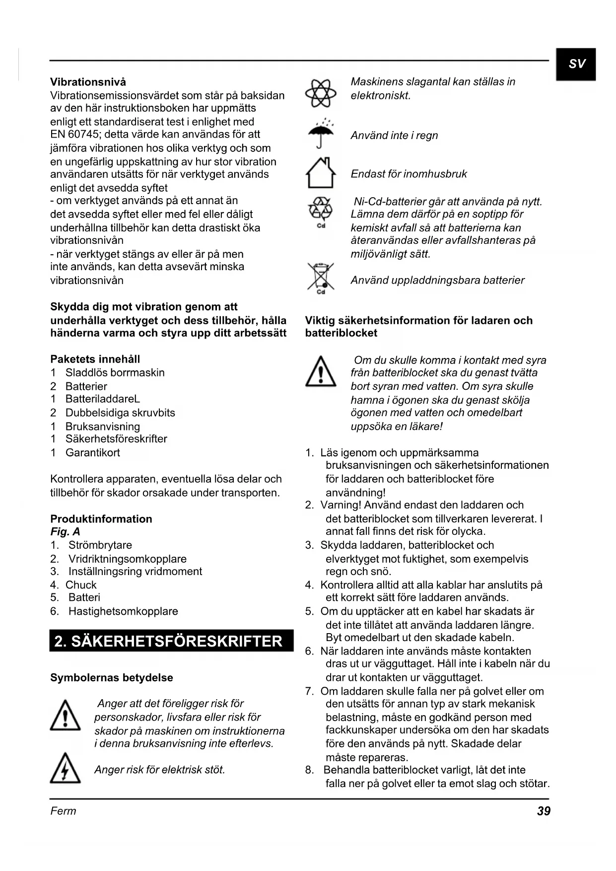 Ferm Vibrationsnivå Vibrationsemissionsvärdet som står på baksidan av den här instruktionsboken har uppmätts enligt ett standardiserat test i enlighet med EN 60745; detta värde kan användas för att jämföra vibrationen hos olika verktyg och som en ungefärlig uppskattning av hur stor vibration användaren utsätts för när verktyget används enligt det avsedda syftet - om verktyget används på ett annat än det avsedda syftet eller med fel eller dåligt underhållna tillbehör kan detta drastiskt öka vibrationsnivån - när verktyget stängs av eller är på men inte används, kan detta avsevärt minska vibrationsnivån Skydda dig mot vibration genom att underhålla verktyget och dess tillbehör, hålla händerna varma och styra upp ditt arbetssätt Paketets innehåll 1 Sladdlös borrmaskin 2 Batterier 1 BatteriladdareL 2 Dubbelsidiga skruvbits 1 Bruksanvisning 1 Säkerhetsföreskrifter 1 Garantikort Kontrollera apparaten, eventuella lösa delar och tillbehör för skador orsakade under transporten. Produktinformation Fig. A