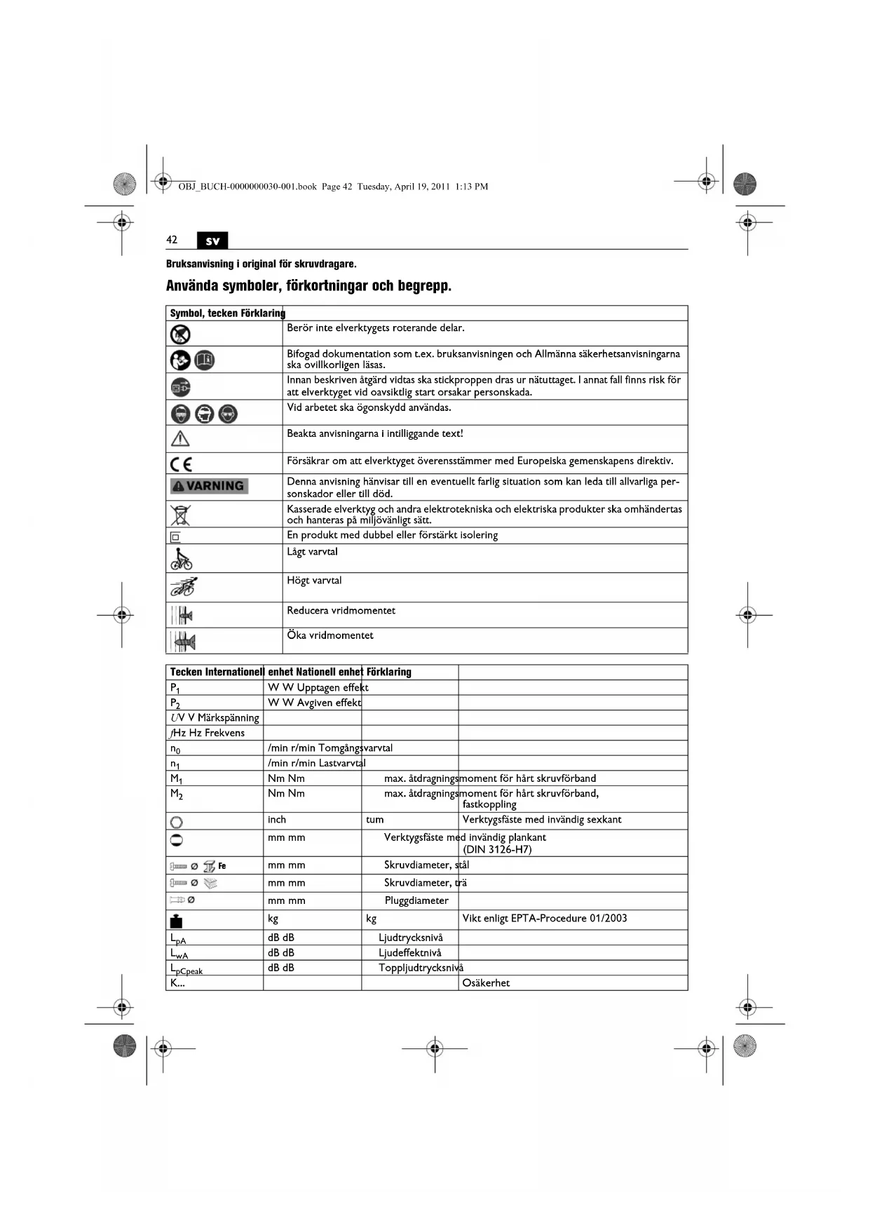 Bruksanvisning i original för skruvdragare. Använda symboler, förkortningar och begrepp. Symbol, tecken Förklaring Berör inte elverktygets roterande delar. Bifogad dokumentation som t.ex. bruksanvisningen och Allmänna säkerhetsanvisningarna ska ovillkorligen läsas. Innan beskriven åtgärd vidtas ska stickproppen dras ur nätuttaget. I annat fall finns risk för att elverktyget vid oavsiktlig start orsakar personskada. Vid arbetet ska ögonskydd användas. Beakta anvisningarna i intilliggande text! Försäkrar om att elverktyget överensstämmer med Europeiska gemenskapens direktiv. Denna anvisning hänvisar till en eventuellt farlig situation som kan leda till allvarliga per- sonskador eller till död. Kasserade elverktyg och andra elektrotekniska och elektriska produkter ska omhändertas och hanteras på miljövänligt sätt. En produkt med dubbel eller förstärkt isolering Lågt varvtal Högt varvtal Reducera vridmomentet Öka vridmomentet Tecken Internationell enhet Nationell enhet Förklaring