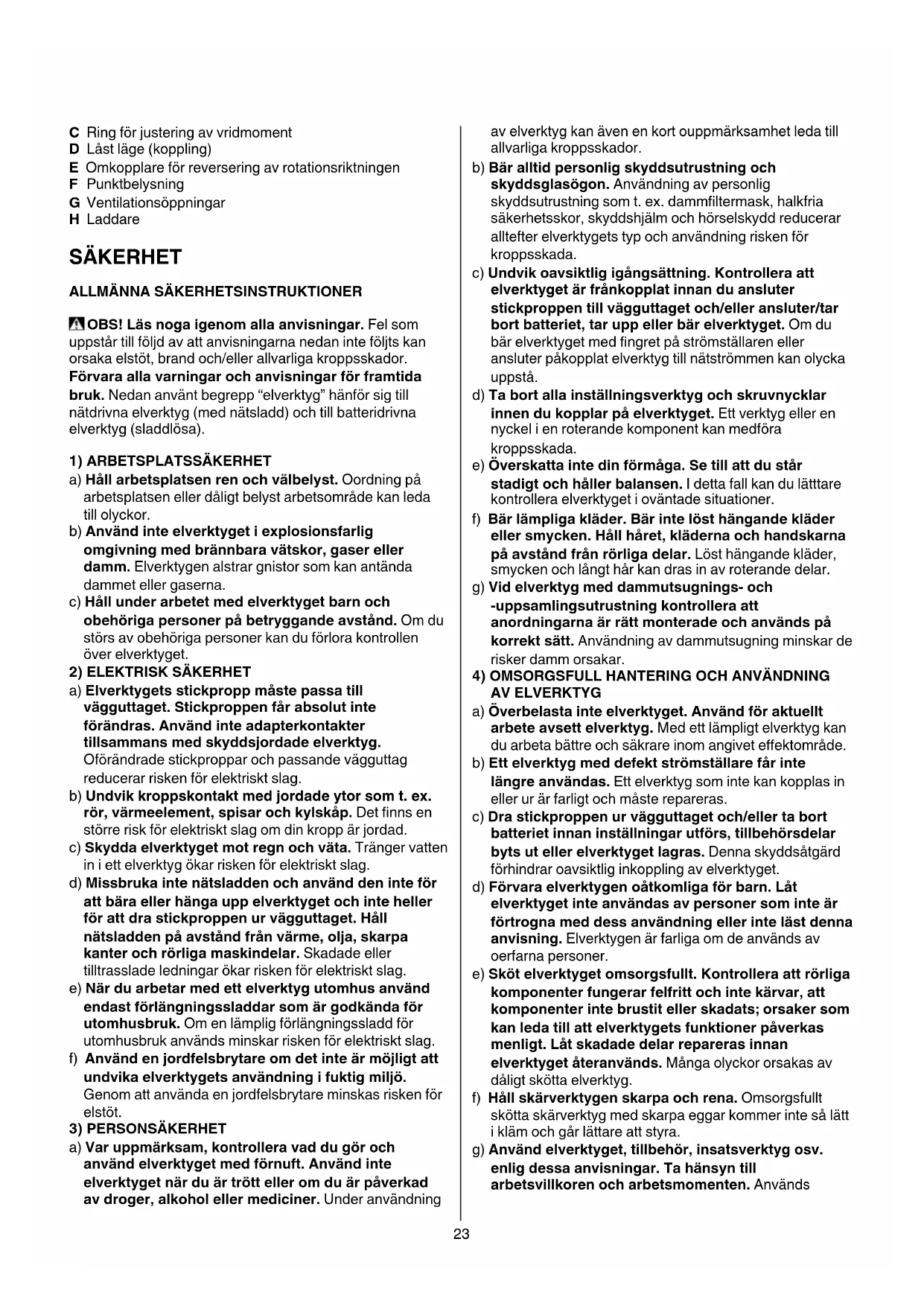 SÄKERHET ALLMÄNNA SÄKERHETSINSTRUKTIONER OBS! Läs noga igenom alla anvisningar. Fel som