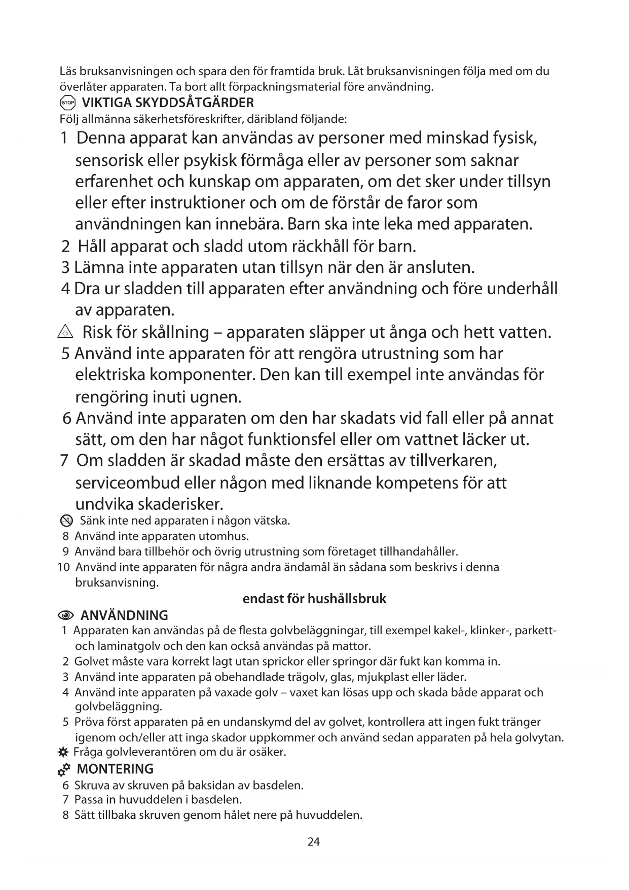Följ allmänna säkerhetsföreskrifter, däribland följande: 1 Denna apparat kan användas av personer med minskad fysisk, sensorisk eller psykisk förmåga eller av personer som saknar erfarenhet och kunskap om apparaten, om det sker under tillsyn eller efter instruktioner och om de förstår de faror som användningen kan innebära. Barn ska inte leka med apparaten. 2 Håll apparat och sladd utom räckhåll för barn. 3 Lämna inte apparaten utan tillsyn när den är ansluten. 4 Dra ur sladden till apparaten efter användning och före underhåll av apparaten. $ Risk för skållning – apparaten släpper ut ånga och hett vatten. 5 Använd inte apparaten för att rengöra utrustning som har elektriska komponenter. Den kan till exempel inte användas för rengöring inuti ugnen. 6 Använd inte apparaten om den har skadats vid fall eller på annat sätt, om den har något funktionsfel eller om vattnet läcker ut. 7 Om sladden är skadad måste den ersättas av tillverkaren, serviceombud eller någon med liknande kompetens för att undvika skaderisker. H Sänk inte ned apparaten i någon vätska. 8 Använd inte apparaten utomhus. 9 Använd bara tillbehör och övrig utrustning som företaget tillhandahåller. 10 Använd inte apparaten för några andra ändamål än sådana som beskrivs i denna bruksanvisning. endast för hushållsbruk
