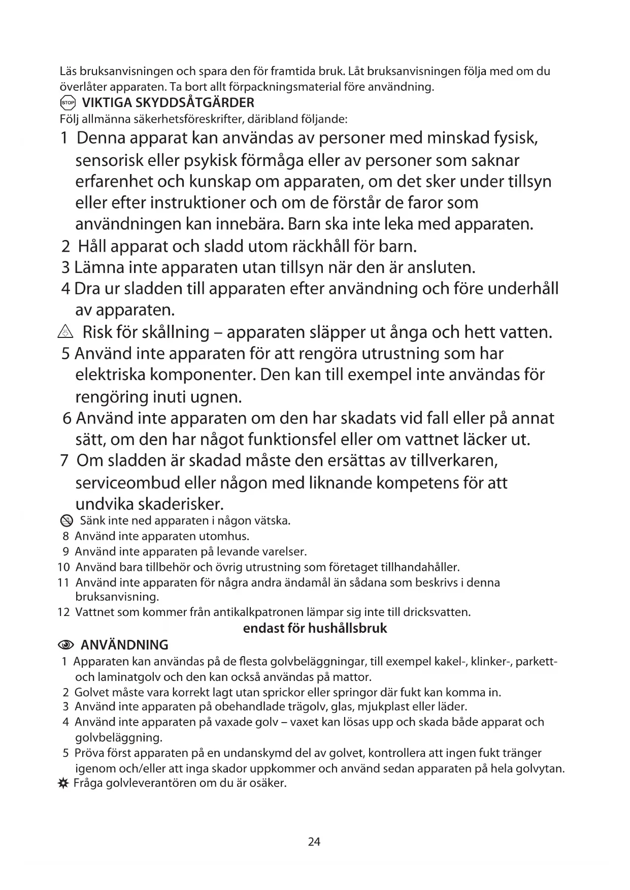 4 Använd inte apparaten på vaxade golv – vaxet kan lösas upp och skada både apparat och