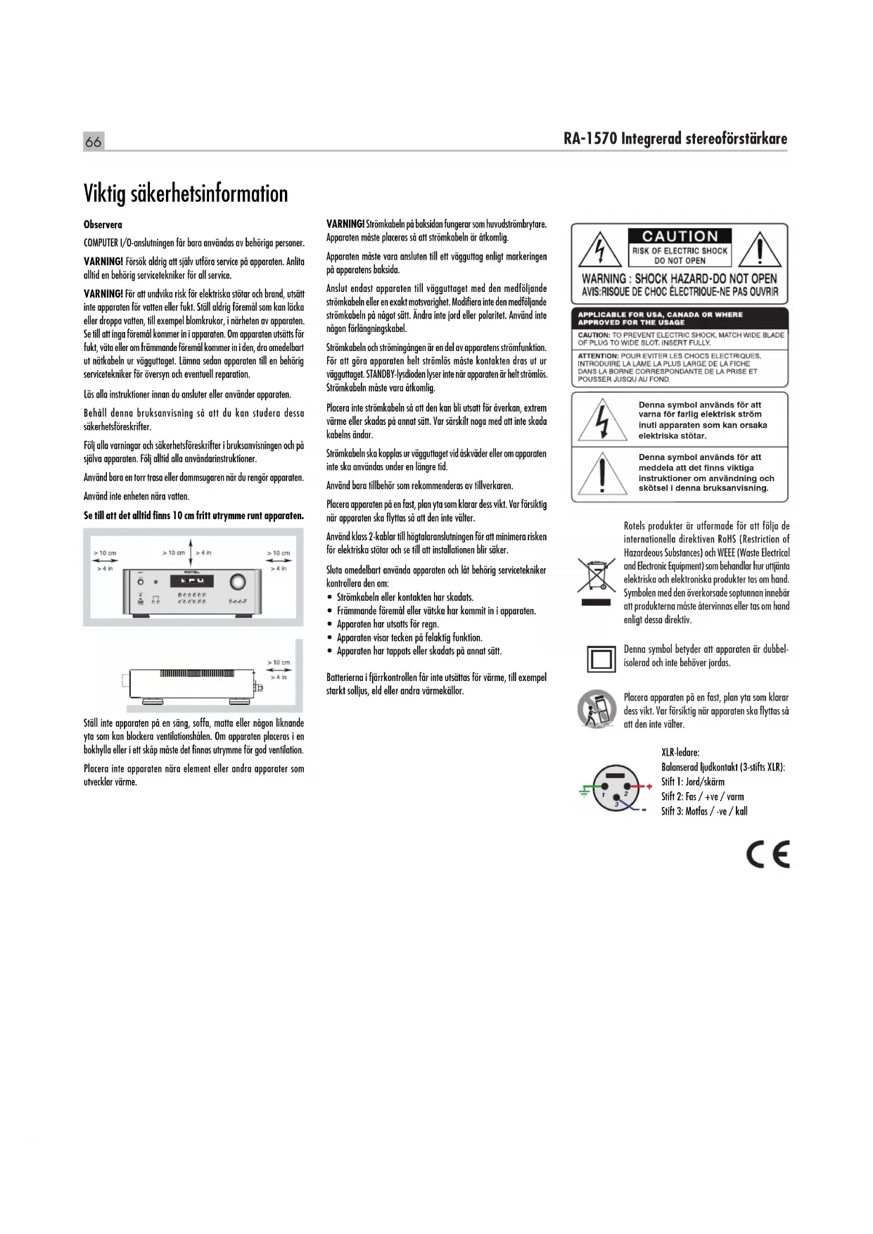 - È richiesta l’installazione di un driver Alimentazione AC 120 V, 60 Hz (USA) AC 230 V, 50 Hz (Europa) Assorbimento alla potenza dichiarata 400 watt Assorbimento in standby < 0,5 watt BTU (4 ohm, alla 1/8th potenza) 728 BTU/h Dimensioni (L x A x P) 431 x 144 x 358 mm Altezza panello frontale 132,6 mm, 3U rack Peso (netto) 13 kg Tutte le caratteristiche dichiarate sono esatte al momento della stampa. Rotel si riserva il diritto di apportare miglioramenti senza alcun preavviso. Rotel e il logo Rotel HiFi sono marchi registrati della The Rotel Co. Ltd. Tokyo Japan.66 67 RA‑1570 Integrerad stereoförstärkare Observera COMPUTER I/O-anslutningen får bara användas av behöriga personer. VARNING! Försök aldrig att själv utföra service på apparaten. Anlita alltid en behörig servicetekniker för all service. VARNING! För att undvika risk för elektriska stötar och brand, utsätt inte apparaten för vatten eller fukt. Ställ aldrig föremål som kan läcka eller droppa vatten, till exempel blomkrukor, i närheten av apparaten. Se till att inga föremål kommer in i apparaten. Om apparaten utsätts för fukt, väta eller om främmande föremål kommer in i den, dra omedelbart ut nätkabeln ur vägguttaget. Lämna sedan apparaten till en behörig servicetekniker för översyn och eventuell reparation. Läs alla instruktioner innan du ansluter eller använder apparaten. Behåll denna bruksanvisning så att du kan studera dessa säkerhetsföreskrifter. Följ alla varningar och säkerhetsföreskrifter i bruksanvisningen och på själva apparaten. Följ alltid alla användarinstruktioner. Använd bara en torr trasa eller dammsugaren när du rengör apparaten. Använd inte enheten nära vatten. Se till att det alltid finns 10 cm fritt utrymme runt apparaten. Ställ inte apparaten på en säng, soffa, matta eller någon liknande yta som kan blockera ventilationshålen. Om apparaten placeras i en bokhylla eller i ett skåp måste det finnas utrymme för god ventilation. Placera inte apparaten nära element eller andra apparater som utvecklar värme. Rotels produkter är utformade för att följa de internationella direktiven RoHS (Restriction of Hazardeous Substances) och WEEE (Waste Electrical and Electronic Equipment) som behandlar hur uttjänta elektriska och elektroniska produkter tas om hand. Symbolen med den överkorsade soptunnan innebär att produkterna måste återvinnas eller tas om hand enligt dessa direktiv. Denna symbol betyder att apparaten är dubbel- isolerad och inte behöver jordas. Viktig säkerhetsinformation VARNING! Strömkabeln på baksidan fungerar som huvudströmbrytare. Apparaten måste placeras så att strömkabeln är åtkomlig. Apparaten måste vara ansluten till ett vägguttag enligt markeringen på apparatens baksida. Anslut endast apparaten till vägguttaget med den medföljande strömkabeln eller en exakt motsvarighet. Modifiera inte den medföljande strömkabeln på något sätt. Ändra inte jord eller polaritet. Använd inte någon förlängningskabel. Strömkabeln och strömingången är en del av apparatens strömfunktion. För att göra apparaten helt strömlös måste kontakten dras ut ur vägguttaget. STANDBY-lysdioden lyser inte när apparaten är helt strömlös. Strömkabeln måste vara åtkomlig. Placera inte strömkabeln så att den kan bli utsatt för åverkan, extrem värme eller skadas på annat sätt. Var särskilt noga med att inte skada kabelns ändar. Strömkabeln ska kopplas ur vägguttaget vid åskväder eller om apparaten inte ska användas under en längre tid. Använd bara tillbehör som rekommenderas av tillverkaren. Placera apparaten på en fast, plan yta som klarar dess vikt. Var försiktig när apparaten ska flyttas så att den inte välter. Använd klass 2-kablar till högtalaranslutningen för att minimera risken för elektriska stötar och se till att installationen blir säker. Sluta omedelbart använda apparaten och låt behörig servicetekniker kontrollera den om: