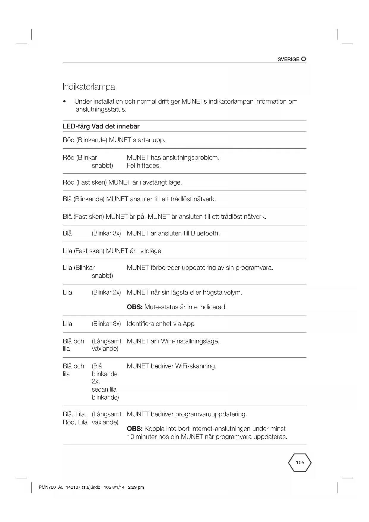 - Under installation och normal drift ger MUNETs indikatorlampan information om anslutningsstatus. LED-färg Vad det innebär Röd (Blinkande) MUNET startar upp. Röd (Blinkar snabbt) MUNET has anslutningsproblem. Fel hittades. Röd (Fast sken) MUNET är i avstängt läge. Blå (Blinkande) MUNET ansluter till ett trådlöst nätverk. Blå (Fast sken) MUNET är på. MUNET är ansluten till ett trådlöst nätverk. Blå (Blinkar 3x) MUNET är ansluten till Bluetooth. Lila (Fast sken) MUNET är i viloläge. Lila (Blinkar snabbt) MUNET förbereder uppdatering av sin programvara. Lila (Blinkar 2x) MUNET når sin lägsta eller högsta volym. OBS: Mute-status är inte indicerad. Lila (Blinkar 3x) Identifiera enhet via App Blå och lila (Långsamt växlande) MUNET är i WiFi-inställningsläge. Blå och lila (Blå blinkande 2x, sedan lila blinkande) MUNET bedriver WiFi-skanning. Blå, Lila, Röd, Lila (Långsamt växlande) MUNET bedriver programvaruuppdatering. OBS: Koppla inte bort internet-anslutningen under minst