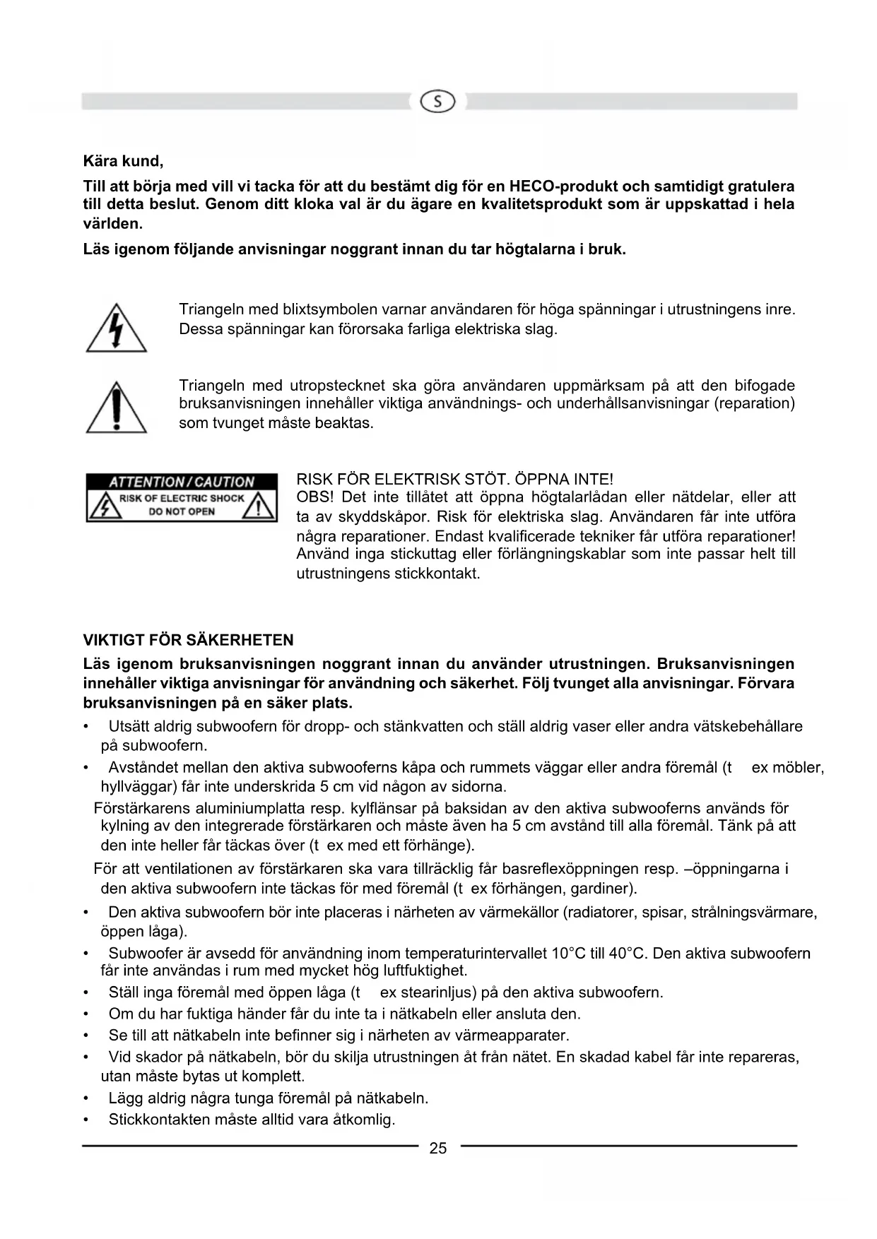 Configuração: Bassreflex,princípiosidefire Equipamento Estágio excitador de curso longo de 30 cm Capacidade de saída RMS / Máx.: 180 / 320 Watt Faixa de frequência: 20...150 Hz Frequênciadeseparação: 50...150Hzregulável Dimensões (LxAxP): 290 x 500 x 464 mm Acessórios: Cabodeligaçãoàrede RESERVADOS OS DIREITOS DE ALTERAÇÕES TÉCNICAS.25 Kära kund, Till att börja med vill vi tacka för att du bestämt dig för en HECO-produkt och samtidigt gratulera till detta beslut. Genom ditt kloka val är du ägare en kvalitetsprodukt som är uppskattad i hela världen. Läs igenom följande anvisningar noggrant innan du tar högtalarna i bruk. Triangeln med blixtsymbolen varnar användaren för höga spänningar i utrustningens inre. Dessa spänningar kan förorsaka farliga elektriska slag. Triangeln med utropstecknet ska göra användaren uppmärksam på att den bifogade bruksanvisningen innehåller viktiga användnings- och underhållsanvisningar (reparation) som tvunget måste beaktas. RISK FÖR ELEKTRISK STÖT. ÖPPNA INTE! OBS! Det inte tillåtet att öppna högtalarlådan eller nätdelar, eller att ta av skyddskåpor. Risk för elektriska slag. Användaren får inte utföra några reparationer. Endast kvalificerade tekniker får utföra reparationer! Använd inga stickuttag eller förlängningskablar som inte passar helt till utrustningens stickkontakt.