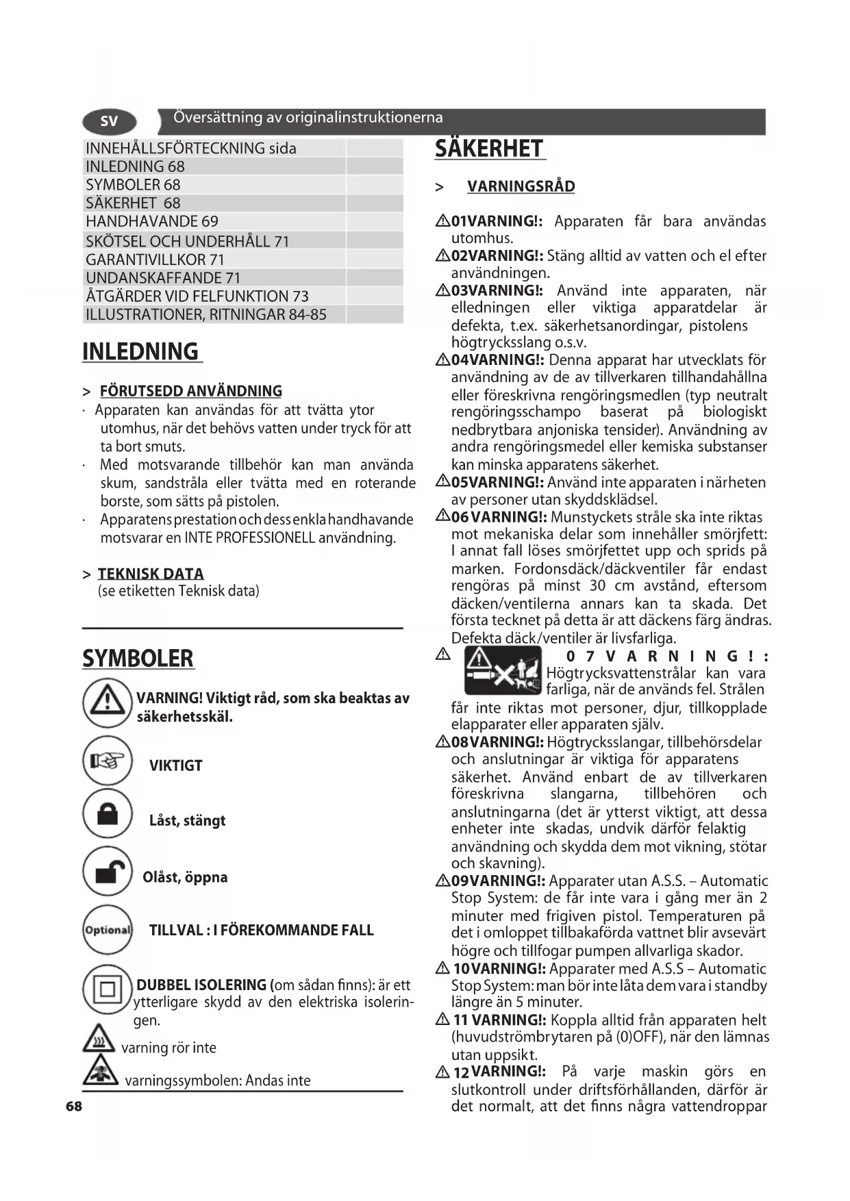 09 VARNING!: Apparater utan A.S.S. – Automatic Stop System: de får inte vara i gång mer än 2 minuter med frigiven pistol. Temperaturen på det i omloppet tillbakaförda vattnet blir avsevärt högre och tillfogar pumpen allvarliga skador.