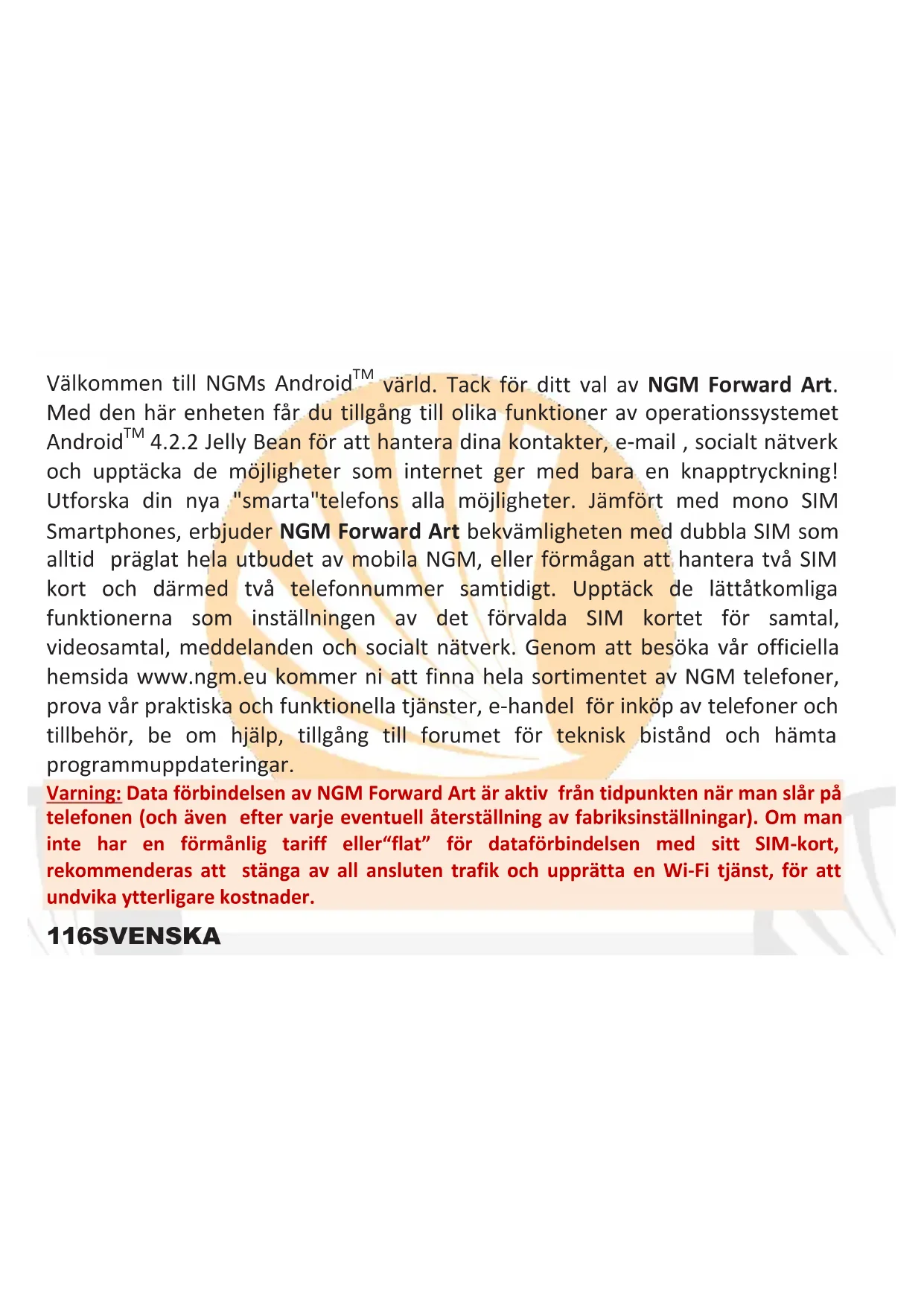 NGM. För mer information om licensen och upplysningar av användandet av systemet besök www.ngm.eu.131SVENSKA Varning: formatering och innehåll av denna handbok baseras på AndroidTM operativsystem,tillverkaren har inget ansvar för brott mot de riktlinjer som anges ovan eller för missbruk av telefonen . Tillverkaren förbehåller sig rätten att ändra utan föregående varning informationen i denna manual. innehållet i denna manual kan skilja sig från det faktiska innehållet som visas på telefonen . I detta fall ska det senare ha företräde.