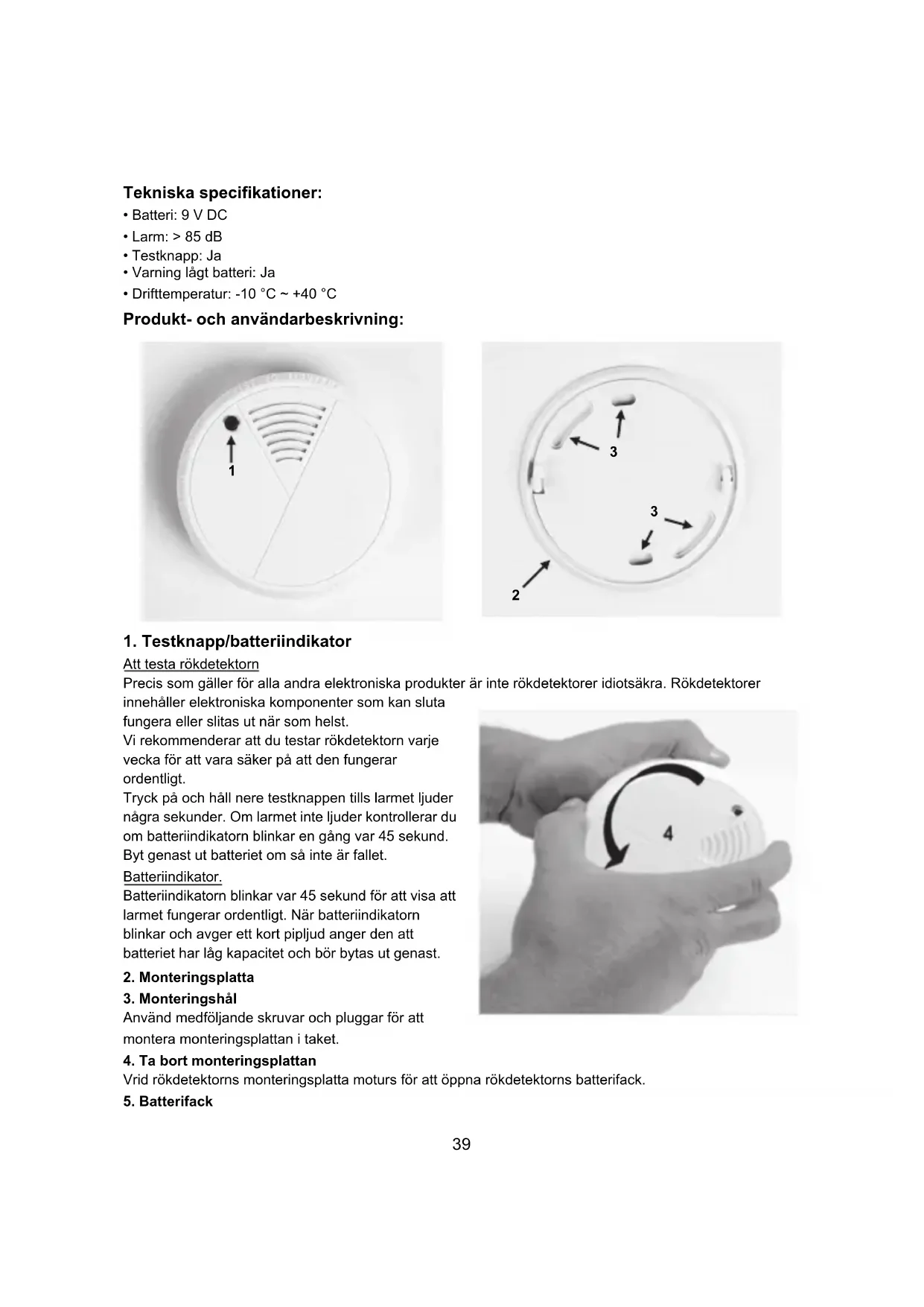 Vrid rökdetektorns monteringsplatta moturs för att öppna rökdetektorns batterifack.