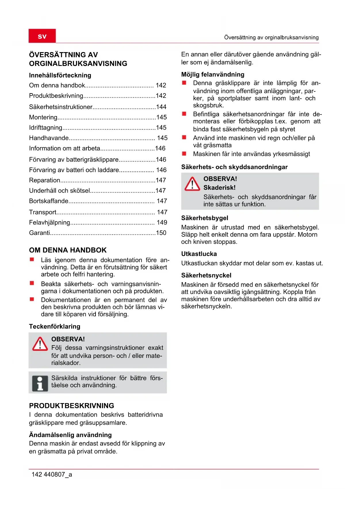 SV Översättning av orginalbruksanvisning 142