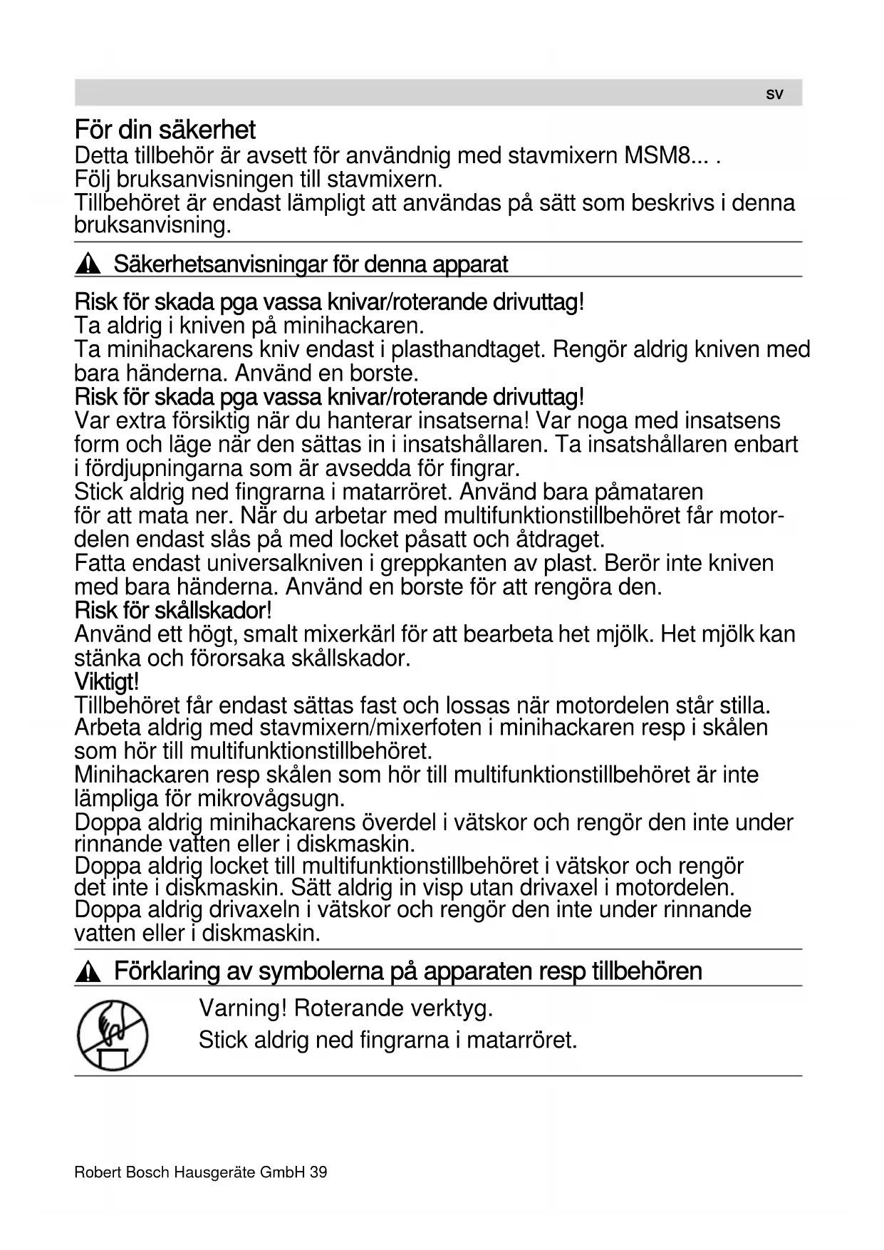 sv40 Robert Bosch Hausgeräte GmbHLäs noga denna bruksanvisning före använd-ning för att få viktiga anvisningar om säkerhet och om hur denna apparat används.Spara bruksanvisningen. Låt bruksanvisningen följa med apparaten vid ett eventuellt ägarbyte. Minihackaren L Vik ut bildsidorna.Bild 1 Minihackaren L/XL2Kniv3 Överdel4Lock5 Ice Crush-kniv (gäller endast storlek L)Med minihackaren XL utnyttjar du till fullo apparatens kapacitet när du bereder honungs-pålägg (om uppgifter i receptet överhålls, se separat bruksanvisning för detta tillbehör).Minihackaren kan beställas via kundtjänst (Best.nr. 753122). Användning Minihackaren är lämplig för att finfördela kött, hård ost, lök, kryddväxter, vitlök, frukt, grön-saker, nötter, mandel. Det är viktigt att noga följa de maxmängder och bearbetningstider som anges i tabellen (