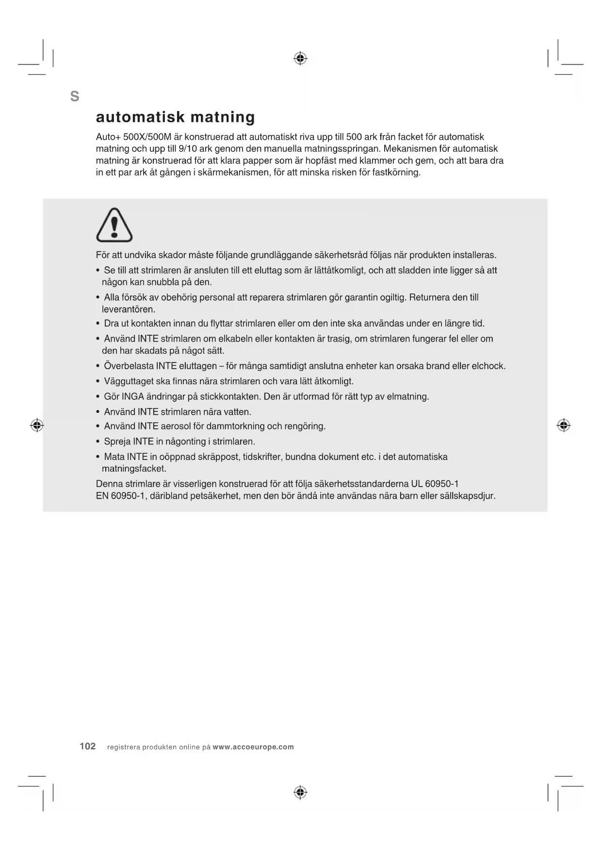 - Mata INTE in oöppnad skräppost, tidskrifter, bundna dokument etc. i det automatiska matningsfacket. Denna strimlare är visserligen konstruerad för att följa säkerhetsstandarderna UL 60950-1 EN 60950-1, däribland petsäkerhet, men den bör ändå inte användas nära barn eller sällskapsdjur. automatisk matning Auto+ 500X/500M är konstruerad att automatiskt riva upp till 500 ark från facket för automatisk matning och upp till 9/10 ark genom den manuella matningsspringan. Mekanismen för automatisk matning är konstruerad för att klara papper som är hopfäst med klammer och gem, och att bara dra in ett par ark åt gången i skärmekanismen, för att minska risken för fastkörning.AUTO+ 500X&500M STRIMLARE 103