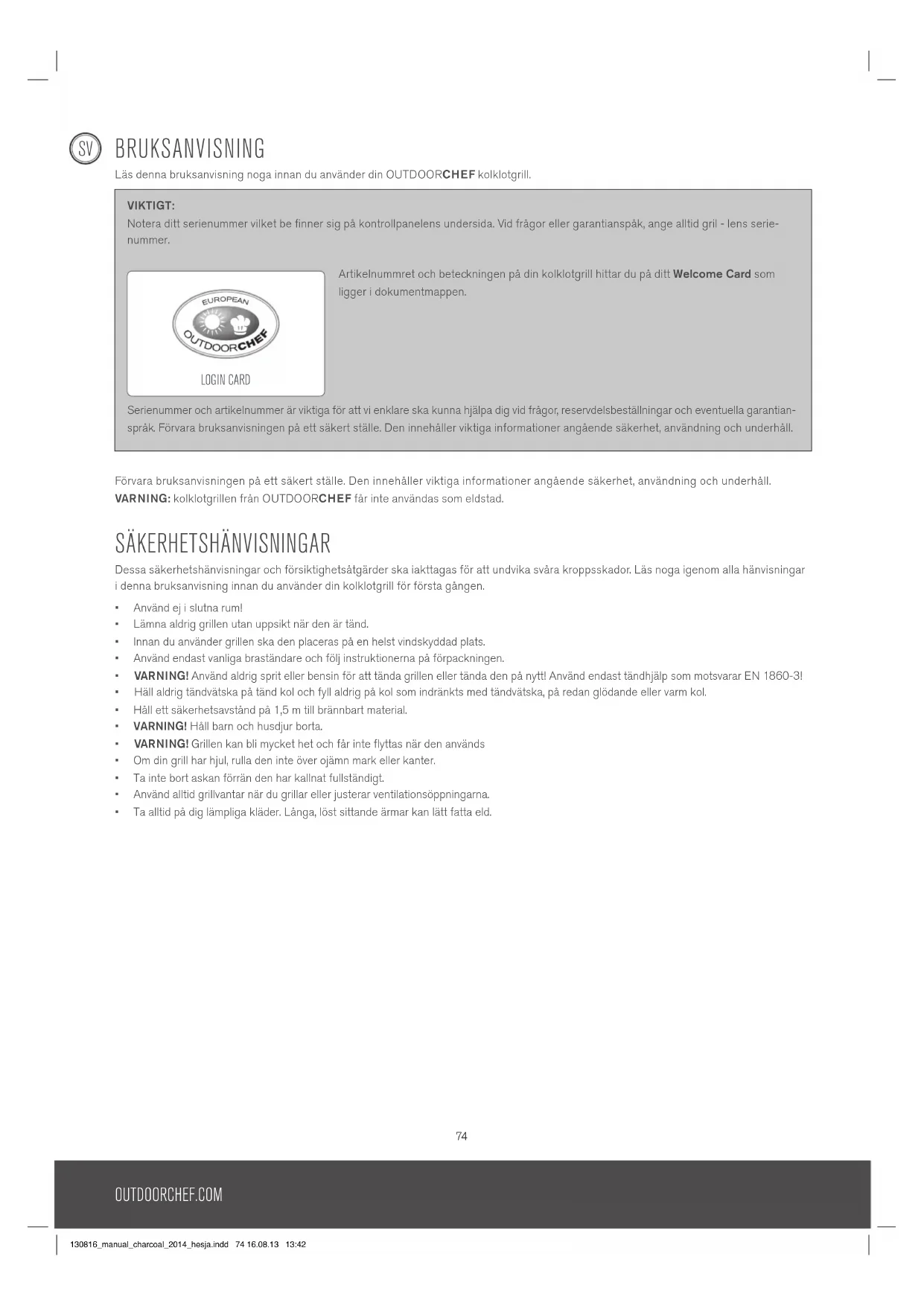 - Ta alltid på dig lämpliga kläder. Långa, löst sittande ärmar kan lätt fatta eld. VIKTIGT: Notera ditt serienummer vilket be finner sig på kontrollpanelens undersida. Vid frågor eller garantianspåk, ange alltid gril - lens serie- nummer. Artikelnummret och beteckningen på din kolklotgrill hittar du på ditt Welcome Card som ligger i dokumentmappen. Serienummer och artikelnummer är viktiga för att vi enklare ska kunna hjälpa dig vid frågor, reservdelsbeställningar och eventuella garantian- språk. Förvara bruksanvisningen på ett säkert ställe. Den innehåller viktiga informationer angående säkerhet, användning och underhåll. LOGIN CARD