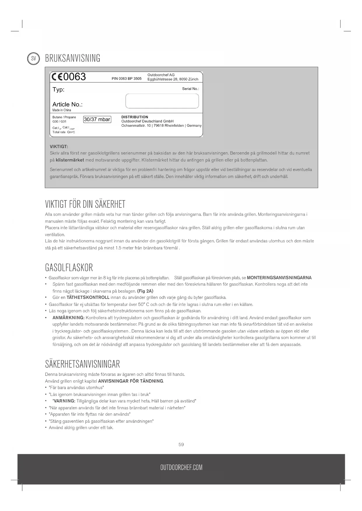 - ”När apparaten används får det inte finnas brännbart material i närheten”• ”Apparaten får inte flyttas när den används”• ”Stäng gasventilen på gasolflaskan efter användningen”• Använd aldrig grillen under ett tak.VIKTIGT:Skriv allra först ner gasolklotgrillens serienummer på baksidan av den här bruksanvisningen. Beroende på grillmodell hittar du numret på klistermärket med motsvarande uppgifter. Klistermärket hittar du antingen på grillen eller på bottenplattan. Serienumret och artikelnumret är viktiga för en problemfri hantering om frågor uppstår eller vid beställningar av reservdelar och vid eventuella garantianspråk. Förvara bruksanvisningen på ett säkert ställe. Den innehåller viktig information om säkerhet, drift och underhåll.