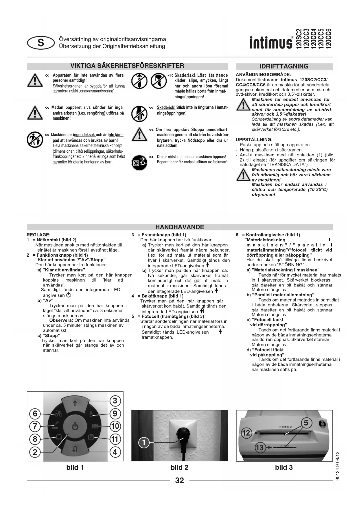 HANDHAVANDE bild 4bild 3 bild 1 Översättning av originaldriftsanvisningarnaÜbersetzung der OriginalbetriebsanleitungMATERIALSTOCKNING I MASKINEN: (Auto-reverse-funktion)Om materialet stockas genom att för mycket material har matats in, reagerar maskinen på följande sätt:- Skärverket blockeras, går därefter en bit bakåt (materialet lossas) och stannar. Motorn stängs av. Kontrollangivelsen (6) tänds.Gör på följande sätt:Pappersstockning i pappersinmatningsenheten (12) - Ta bort pappret som har matats tillbaka.- Skärverket går nu automatiskt framåt och sönderdelar pappersresterna i skärverket. När maskinen går framåt lyser LED-angivelsen i framåtknappen (3). Kontrollangivelsen (6) släcks. - Fortsätt sönderdelningen med en mindre mängd papper än tidigare.Materialstockning i cd-/dvd-inmatningsenheten (13)- Ta bort material som har matats tillbaka.Ta bort material försiktigt, skaderisk genom vassa kanter! - Materialet som är kvar matas nu in automatiskt i skärverket och sönderdelas. När maskinen går framåt lyser LED-angivelsen i framåtknappen (3). Kontrollangivelsen (6) släcks.- När materialet har gått igenom fortsätter du sönderdelningen med rätt dosering. - Om det behövs, koppla skärverket manuellt omväxlande framåt och bakåt tills materialet har gått igenom helt och är sönderdelat.PARALLELL MATERIALINMATNING:Om material matas in samtidigt i inmatningsenheterna, reagerar maskinen på följande sätt:- Skärverket blockeras, går därefter en bit bakåt (materialet lossas) och stannar. Motorn stängs av. Kontrollangivelsen (6) tänds.- Ta ut materialet från en av enheterna. - Tryck kort på framåtknappen (3). Materialet i den andra enheten matas in i skärverket och sönderdelas. Kontrollangivelsen (6) släcks.FOTOCELL TÄCKT VID DÖRRÖPPNING:Om det fortfarande skulle nnas material i någon av de båda inmatningsenheterna när dörren öppnas, stängs motorn av och skärverket stannar. Kontrollangivelsen (6) tänds.Stäng dörren och kvittera statusen genom att trycka kort på framåtknappen (3). Materialet matas in i skärverket och sönderdelas.FOTOCELL TÄCKT VID PÅKOPPLING: Om det skulle nnas material i någon av de båda inmatningsenheterna när maskinen sätts på tänds kontrollangivelsen (6).Ta ut materialet och kvittera statusen genom att trycka kort på framåtknappen (3).MOTORSKYDD:Om motorn skulle överbelastas stängs den av. Kontrollangivelsen (9) tänds.När maskinen har svalnat ca. 25 – 40 minuter (beroende på modell och rumstemperatur) går det att starta om maskinen.ELEKTRISK STÖRNING:Om kontrollangivelsen (9) blinkar tillsammans med LED-angivelsen i funktionsknappen (2) eller endast kontrollangivelsen (8) är det en elektrisk störning. Det går inte att starta maskinen.Kontakta då din fackhandlare.CHECKLISTA VID STÖRNINGAR:Om maskinen inte skulle fungera, kontrollera följande punkter:- Är nätkontakten ansluten till elnätet?- Är dörren stängd? - Är uppsamlingssäcken för papper full? Följ instruktionerna för ”TÖMMA UPPSAMLINGSSÄCKEN FÖR PAPPER”.- Är uppsamlingsbehållaren för cd-/dvd-skivor full? Följ instruktionerna för ”TÖMMA UPPSAMLINGSSÄCKEN FÖR CD-/DVD-SKIVOR”.- Är det materialstockning i maskinen? Följ instruktionerna för ”MATERIALSTOCKNING I MASKINEN”- Har motorn överbelastats? Se under ”MOTORSKYDD”.Om ingen av kontrollpunkterna passar, kontakta din fackhandlare. 120SC2 120CC3 120CC4 120CC5 120CC6