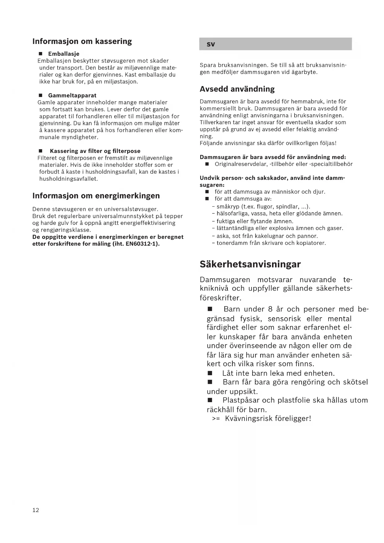 dammsugaren, allt för att undvika risker i användnin-
