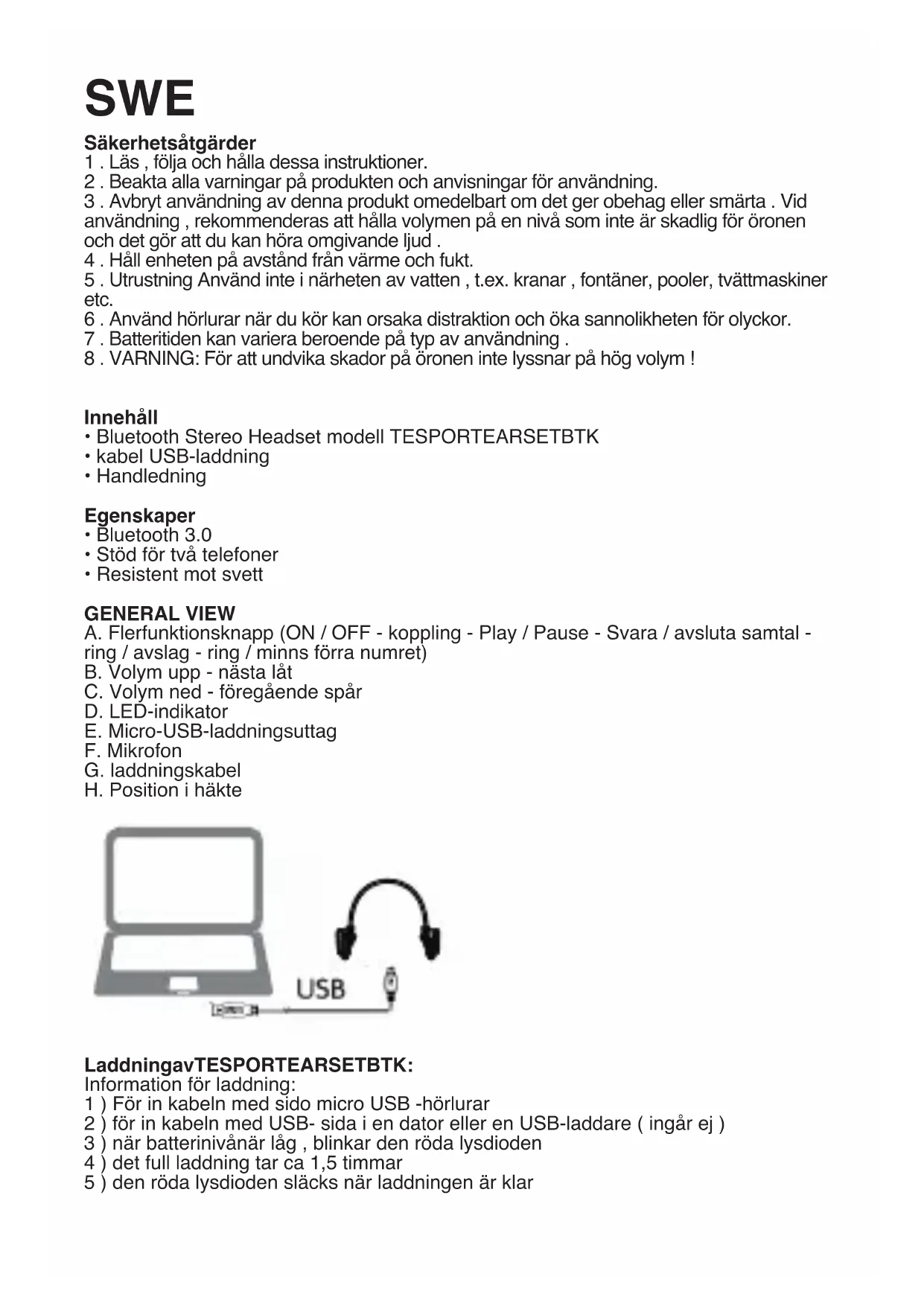 - Resistent mot svett GENERAL VIEW A. Flerfunktionsknapp (ON / OFF - koppling - Play / Pause - Svara / avsluta samtal - ring / avslag - ring / minns förra numret) B. Volym upp - nästa låt C. Volym ned - föregående spår D. LED-indikator E. Micro-USB-laddningsuttag F. Mikrofon G. laddningskabel H. Position i häkte Charging the TESPORTEARSETBTK LaddningavTESPORTEARSETBTK: Information för laddning: 1 ) För in kabeln med sido micro USB -hörlurar 2 ) för in kabeln med USB- sida i en dator eller en USB-laddare ( ingår ej ) 3 ) när batterinivånär låg , blinkar den röda lysdioden 4 ) det full laddning tar ca 1,5 timmar 5 ) den röda lysdioden släcks när laddningen är klarSÄKERHET ANSVARIG FÖR BATTERIlitiumpolymer