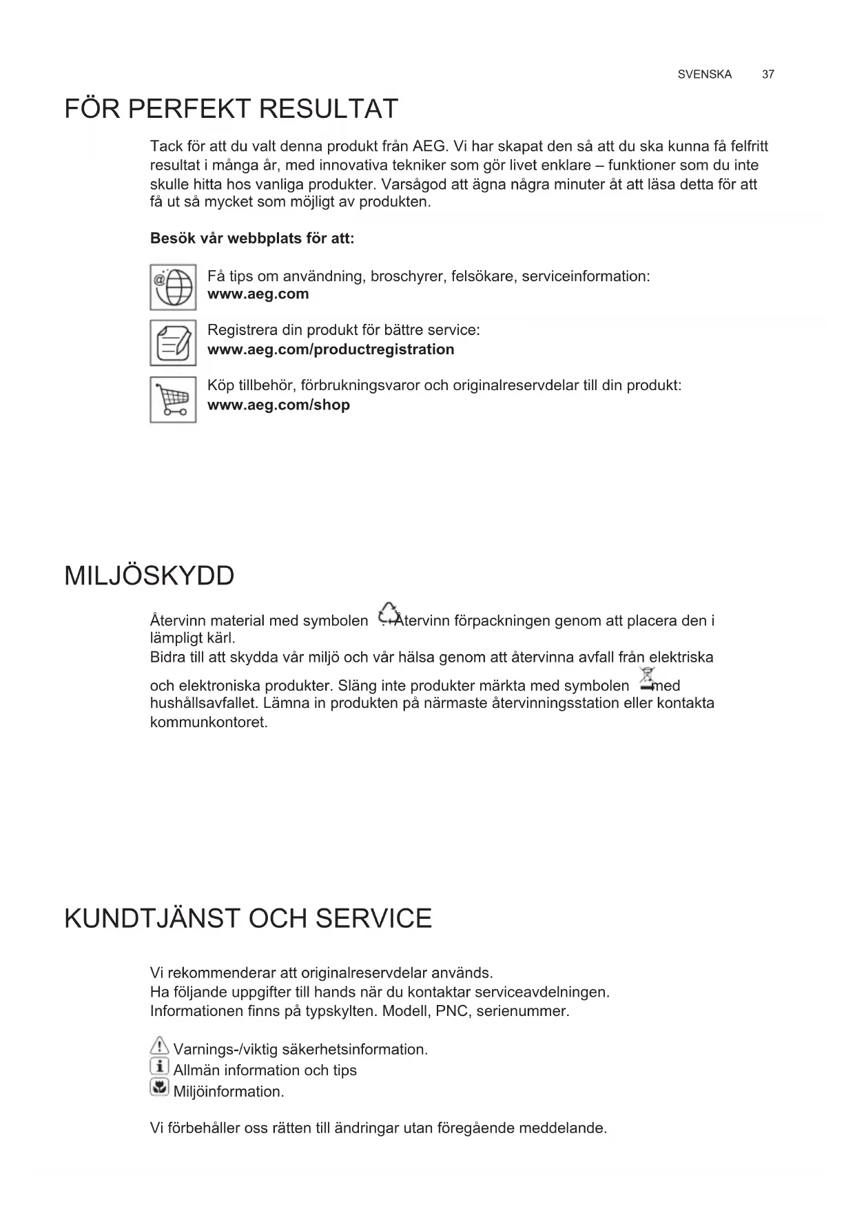 KUNDTJÄNST OCH SERVICE Vi rekommenderar att originalreservdelar används.