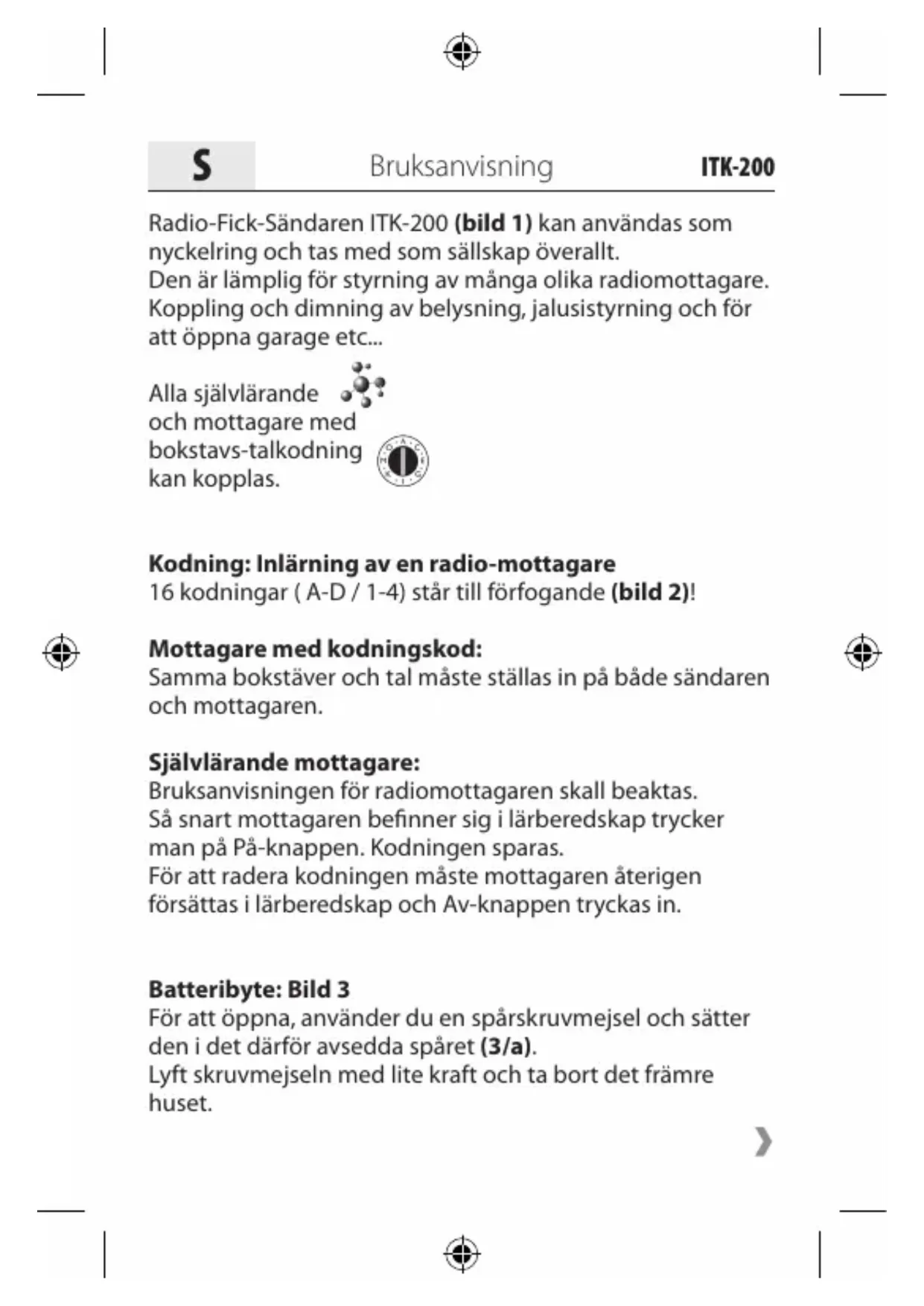 ITK-200Radio-Fick-Sändaren ITK-200 (bild 1) kan användas som nyckelring och tas med som sällskap överallt. Den är lämplig för styrning av många olika radiomottagare. Koppling och dimning av belysning, jalusistyrning och för att öppna garage etc... Alla självlärande och mottagare med bokstavs-talkodning kan kopplas. Kodning: Inlärning av en radio-mottagare 16 kodningar ( A-D / 1-4) står till förfogande (bild 2)! Mottagare med kodningskod: Samma bokstäver och tal måste ställas in på både sändaren och mottagaren. Självlärande mottagare: Bruksanvisningen för radiomottagaren skall beaktas. Så snart mottagaren befinner sig i lärberedskap trycker man på På-knappen. Kodningen sparas. För att radera kodningen måste mottagaren återigen försättas i lärberedskap och Av-knappen tryckas in. Batteribyte: Bild 3 För att öppna, använder du en spårskruvmejsel och sätter den i det därför avsedda spåret (3/a). Lyft skruvmejseln med lite kraft och ta bort det främre huset. Bruksanvisning