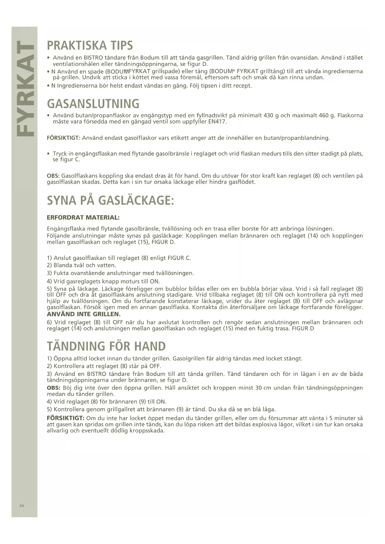 Picknick Gas BBQ «FYRKAT» har du gjort rätt val för en sommar i gott sällskap. En barbecue är nog den enda kulinära tillställningen där ordspråket «Ju flera kockar, dess sämre soppa» inte gäller: Vid utegrillen arbetar många kockar tillsammans. Om du inte är alltför förtjust i feta såser är grillad mat inte bara oöverträffat läcker, men även lätt och hälsosam, särskilt om du väljer magert kött, fisk och grönsaker. Vi önskar dig en smaklig måltid! Återstår oss endast att be dig läsa dessa anvisningar noggrant, eftersom de innehåller viktiga säkerhetsanvisningar och varningar vid sidan av praktiska grilltips, och - naturligtvis - att önska dig en härlig sommar. Med hjärtliga hälsningar från BODUM
