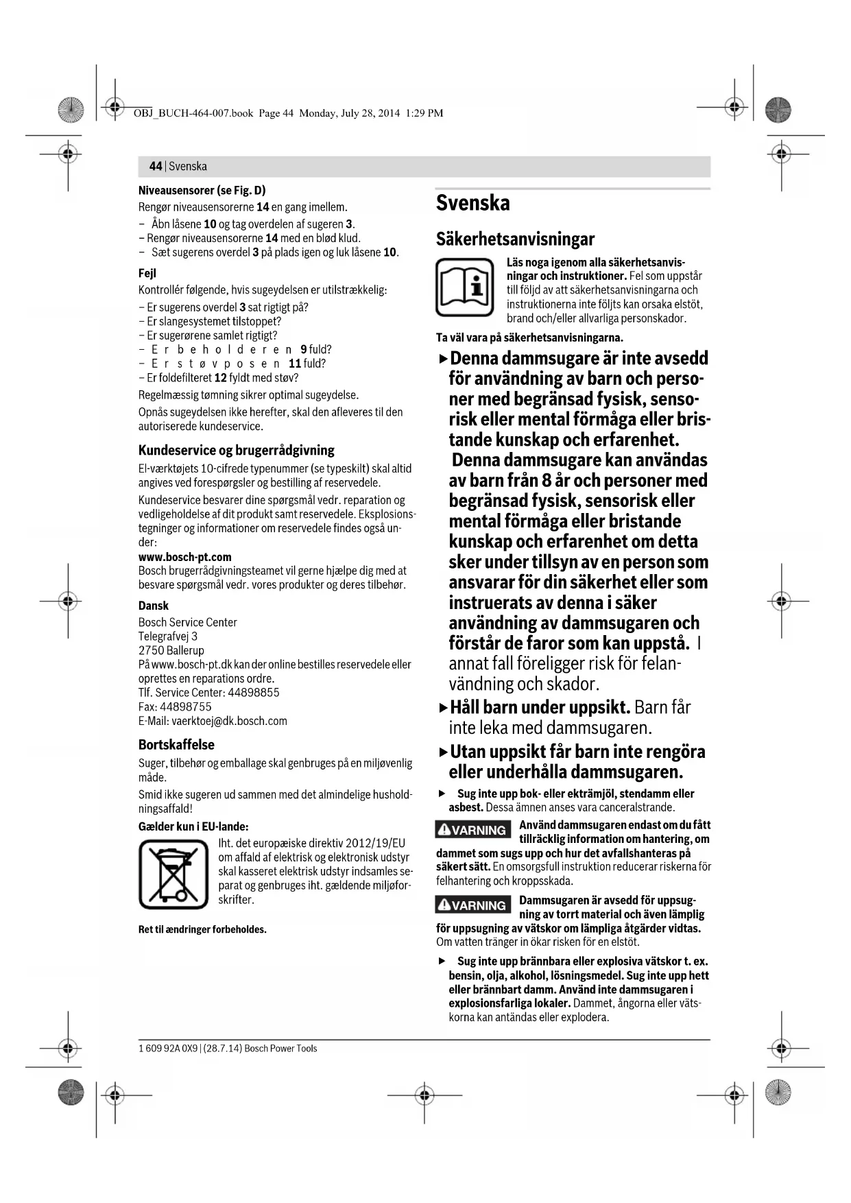 VARNING VARNING OBJ_BUCH-464-007.book Page 44 Monday, July 28, 2014 1:29 PMSvenska | 45 Bosch Power Tools 1 609 92A 0X9 | (28.7.14) Använd stickuttaget endast för de ända-