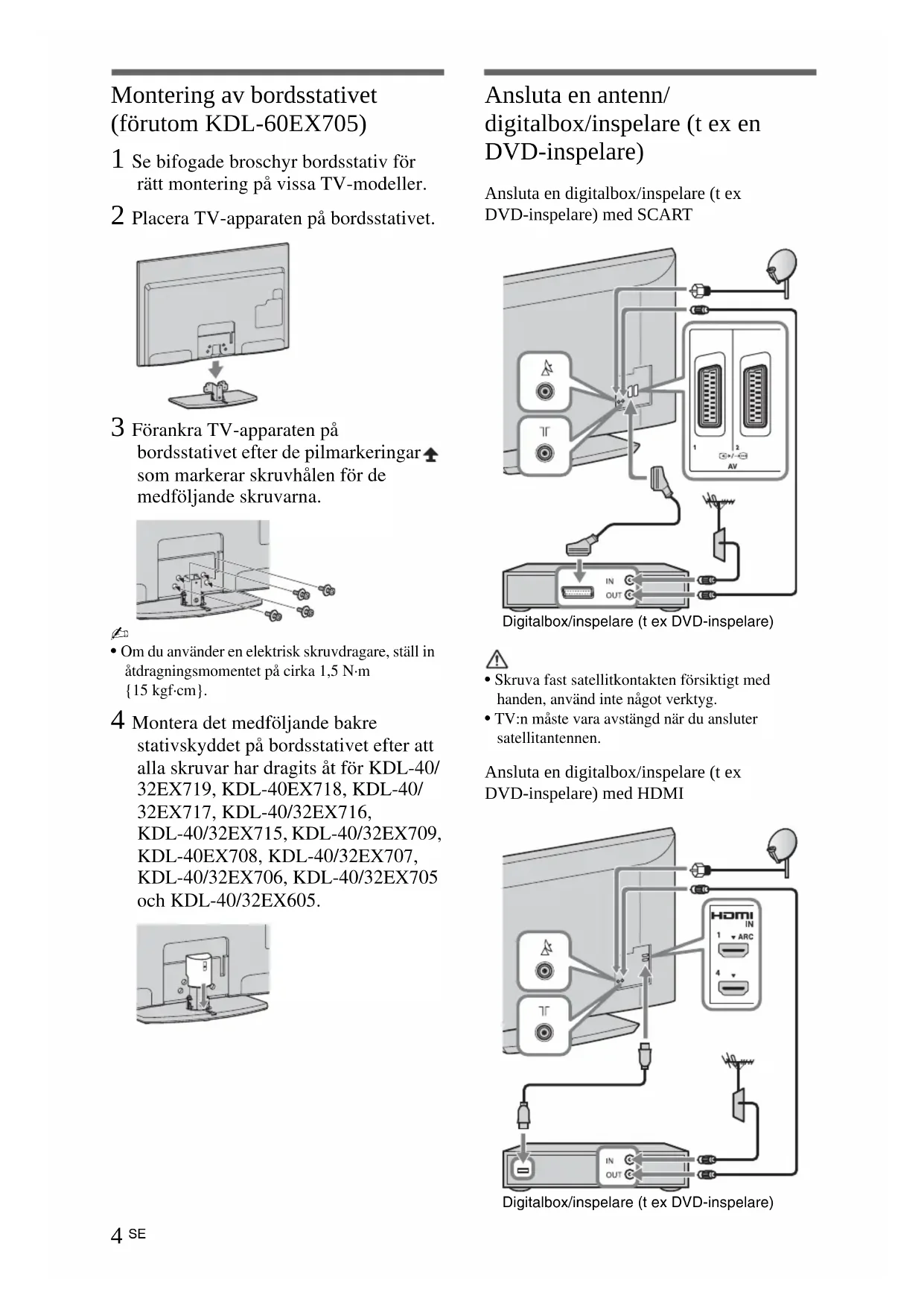 Installation Montering av bordsstativet (förutom KDL-60EX705) 4Ansluta en antenn/digitalbox/inspelare (t ex en DVD-inspelare)4 Förhindra att din TV välter 5