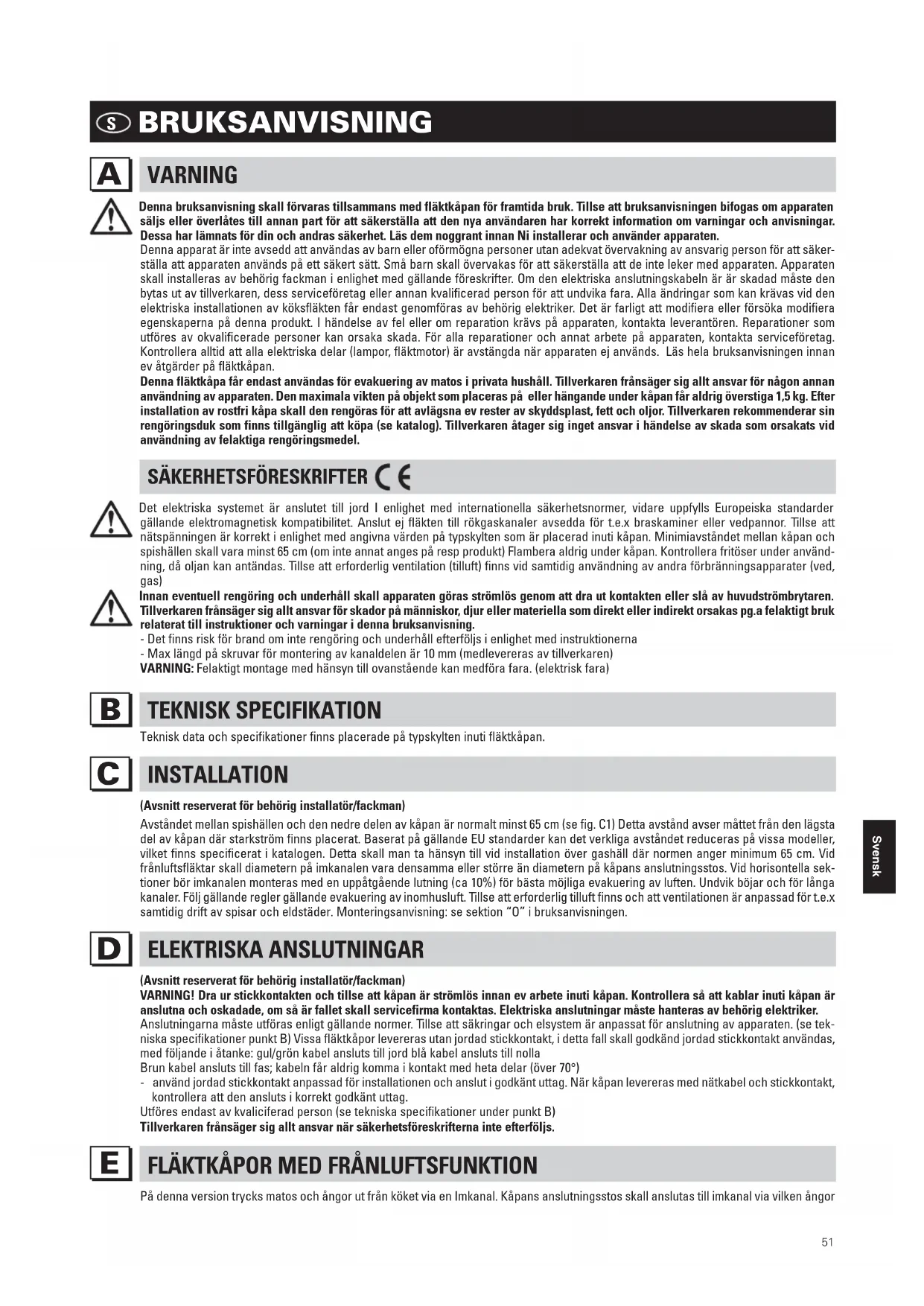 S BRUKSANVISNING VARNING A Denna bruksanvisning skall förvaras tillsammans med fläktkåpan för framtida bruk. Tillse att bruksanvisningen bifogas om apparaten