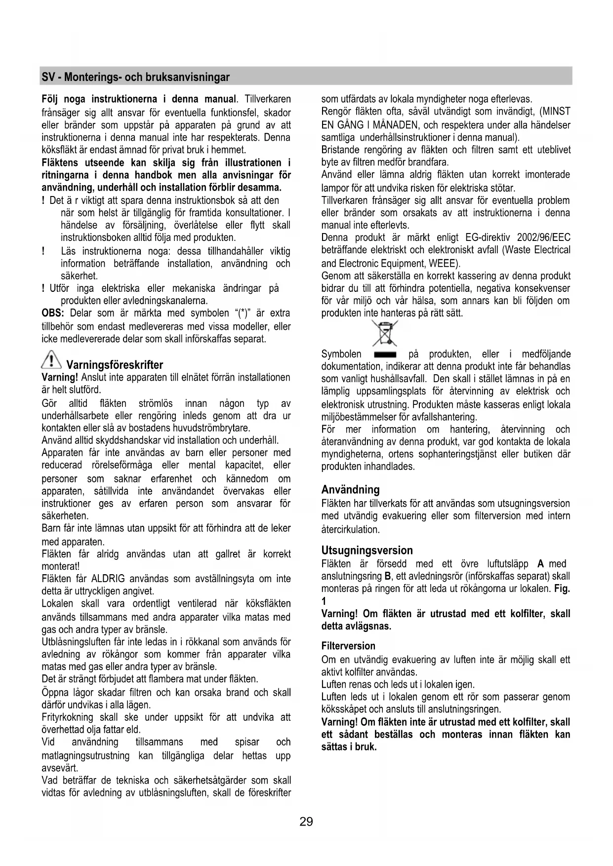 Varning! Om fläkten inte ar utrustad med ett kolfilter, skall att sändant beställas och monteras innan fläkten kan sättas i bruk.
