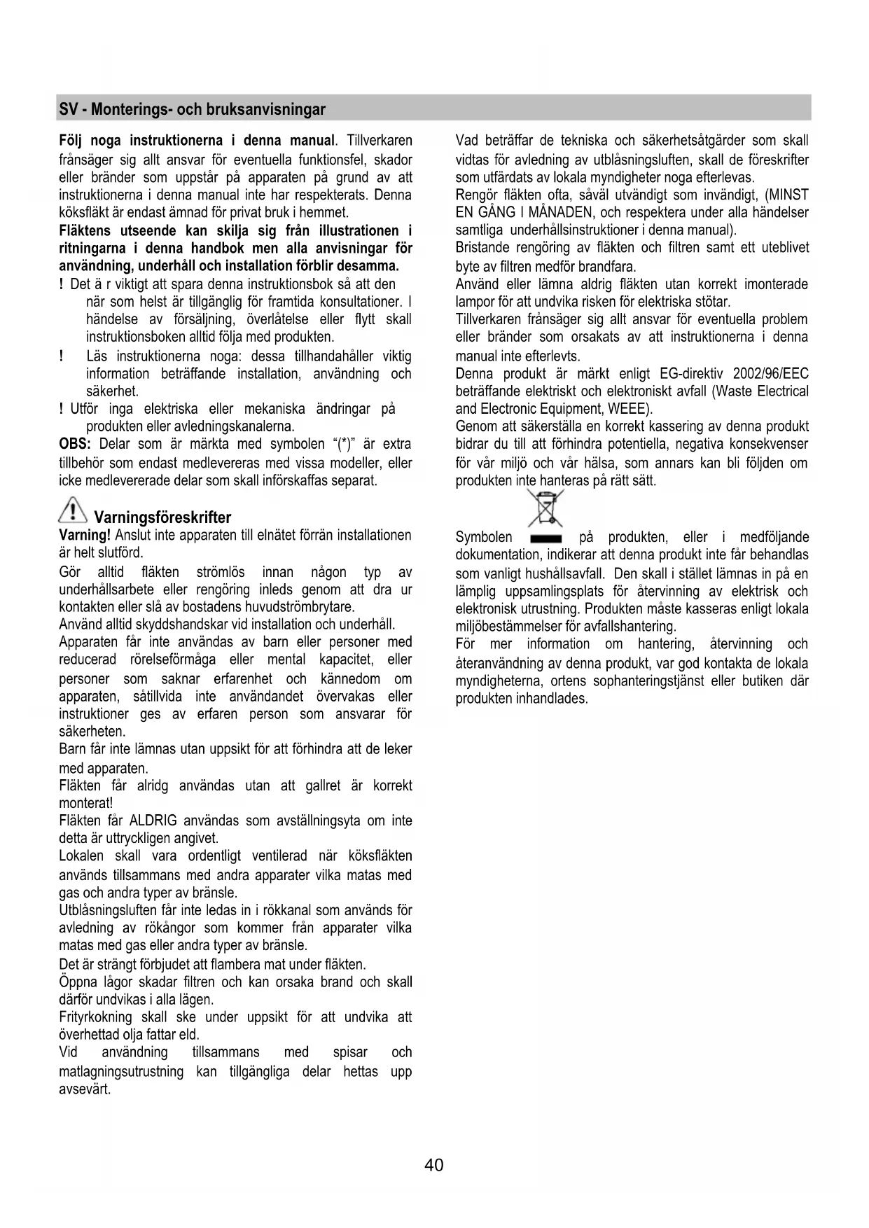 Följ noga instruktionerna ienna manual. Tillverkaren fransager sig allt ansvar for eventuella funktionsfel, skador ellbrander som uppstar pa apparaten na ground av att instruktionerna ienna manual inte har respekterats. Denna koksflakt ar endast amnad for privat bruk i hemmet.