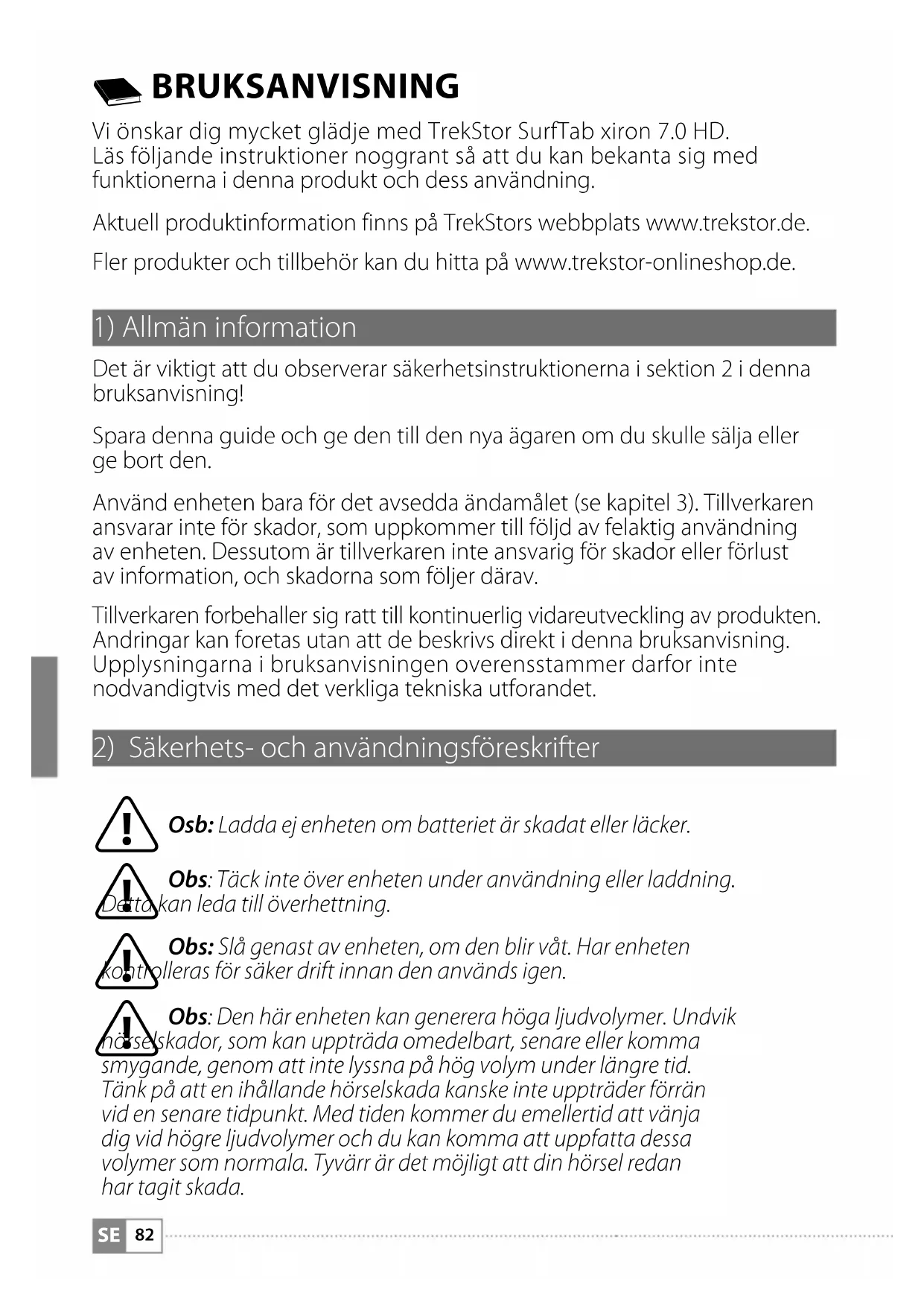BRUKSANVISNING Vi önskar dig mycket glädje med TrekStor SurfTab xiron 7.0 HD. Läs följande instruktioner noggrant så att du kan bekanta sig med funktionerna i denna produkt och dess användning. Aktuell produktinformation finns på TrekStors webbplats www.trekstor.de. Fler produkter och tillbehör kan du hitta på www.trekstor-onlineshop.de.